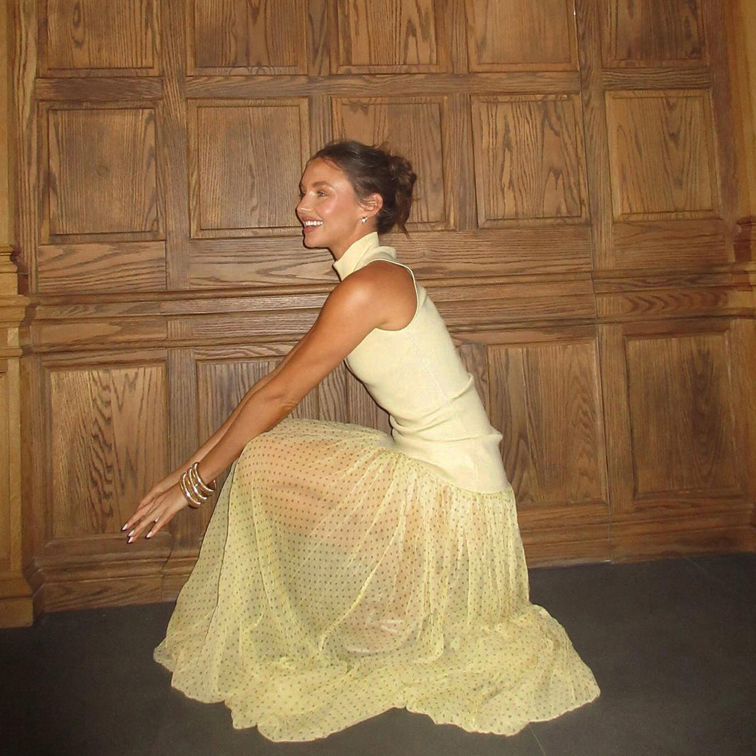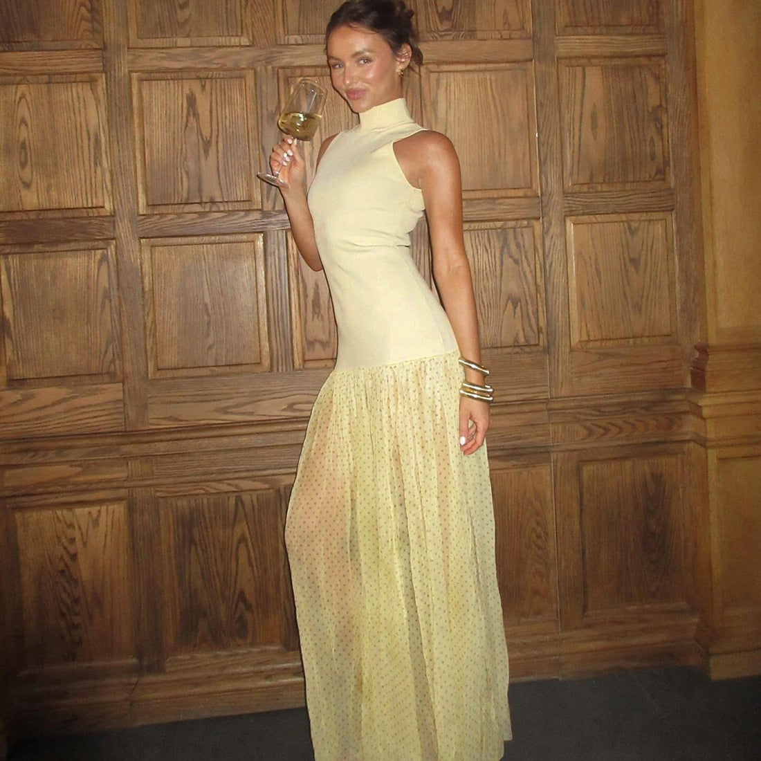 Summer Women Clothing High Collar Slim-Fitting Patchwork Maxi Dress Polka Dot Dress