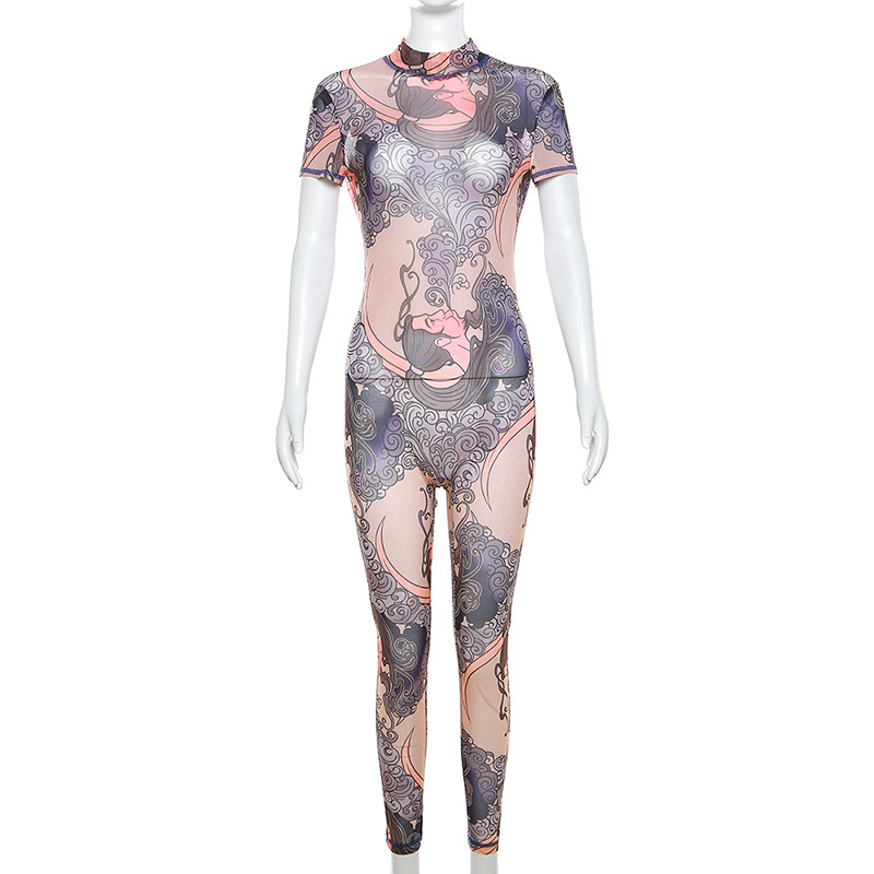 Summer Women Clothing Sexy See through Mesh Floral Print Hollow Out Cutout Backless Tight Casual Jumpsuit