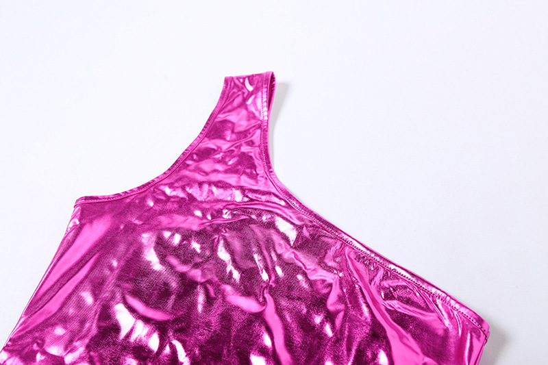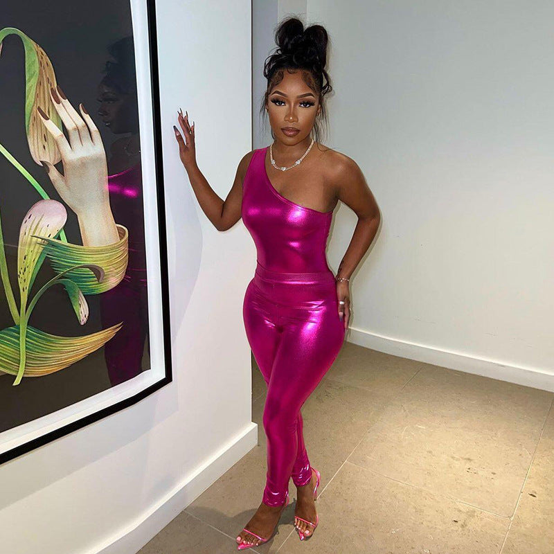 Summer Women Sexy Glossy One Shoulder Top Jumpsuit High Waist Sheath Trousers Suit Women