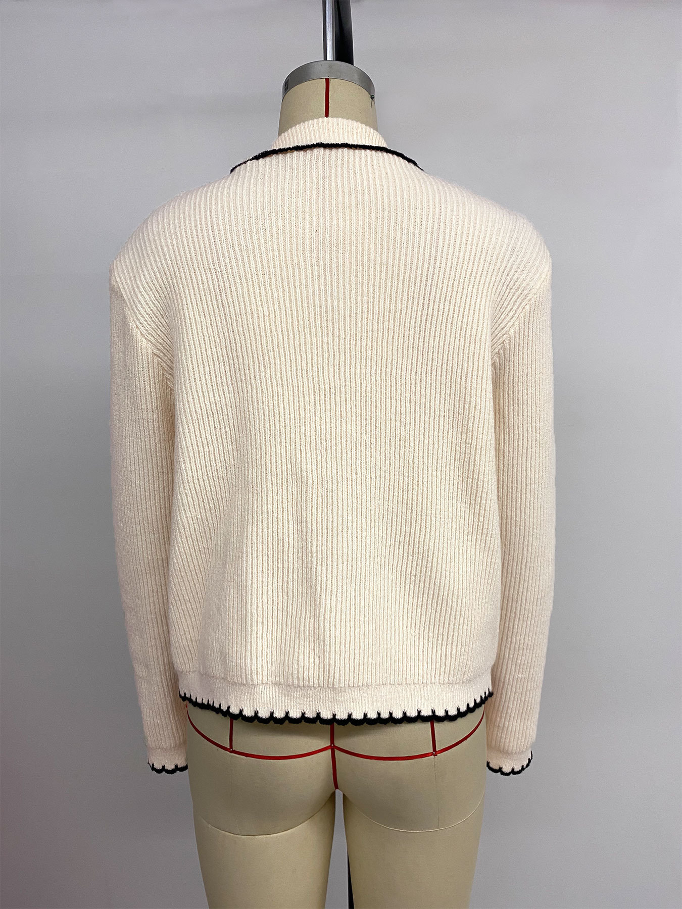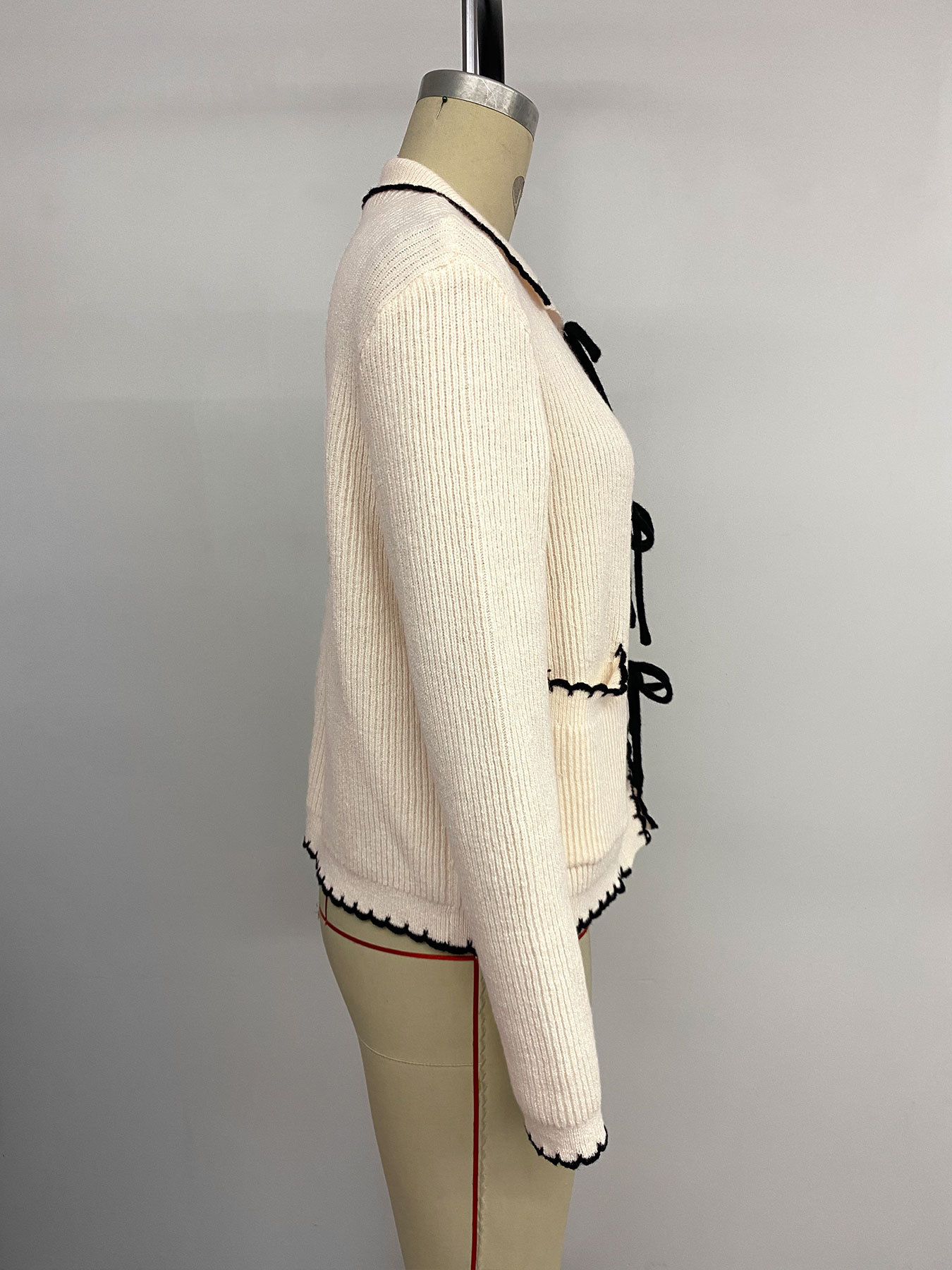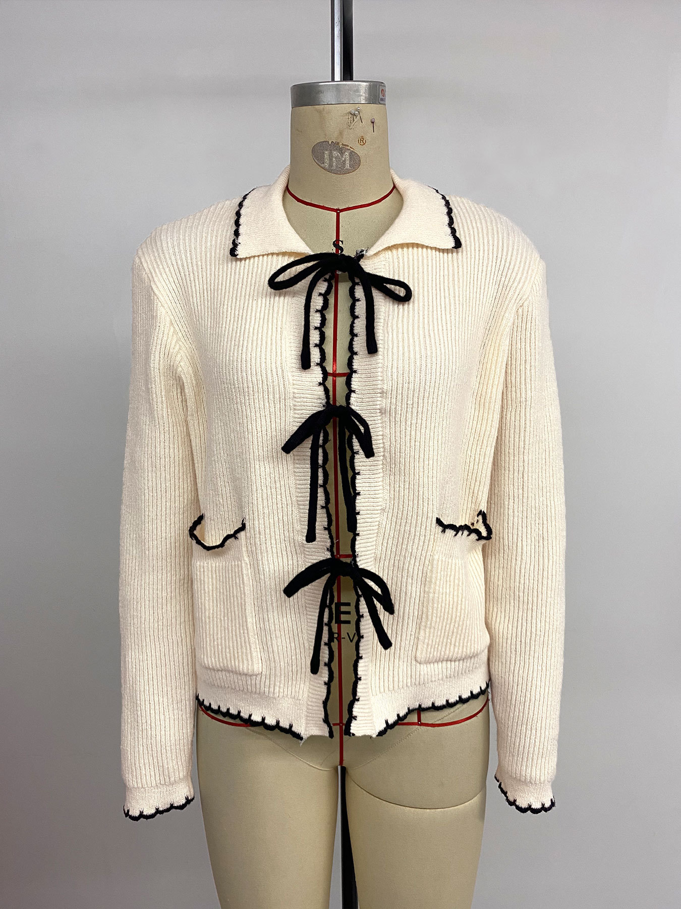 Sweet Chanel Bow Lace up Turn down Collar Trim Contrast Color Sweater Women Cardigan