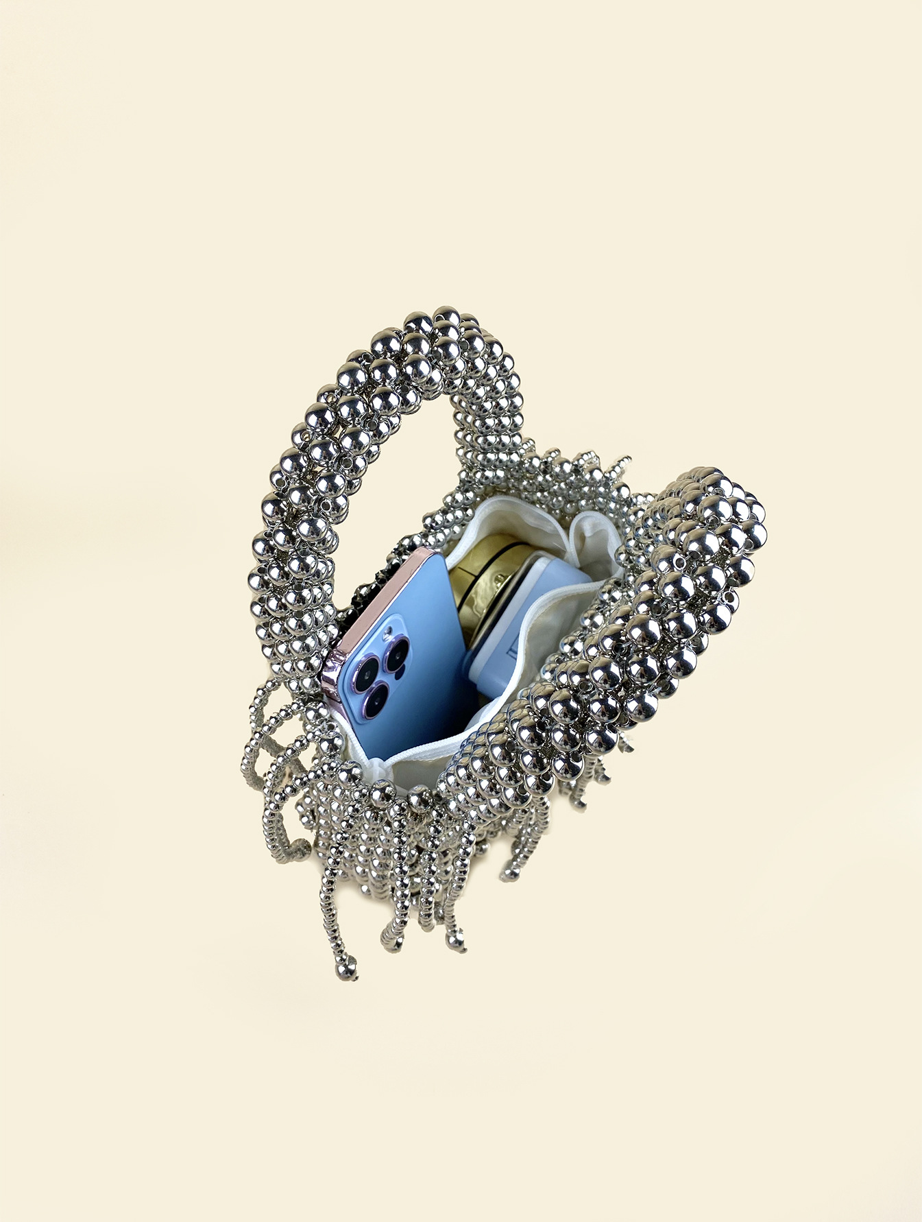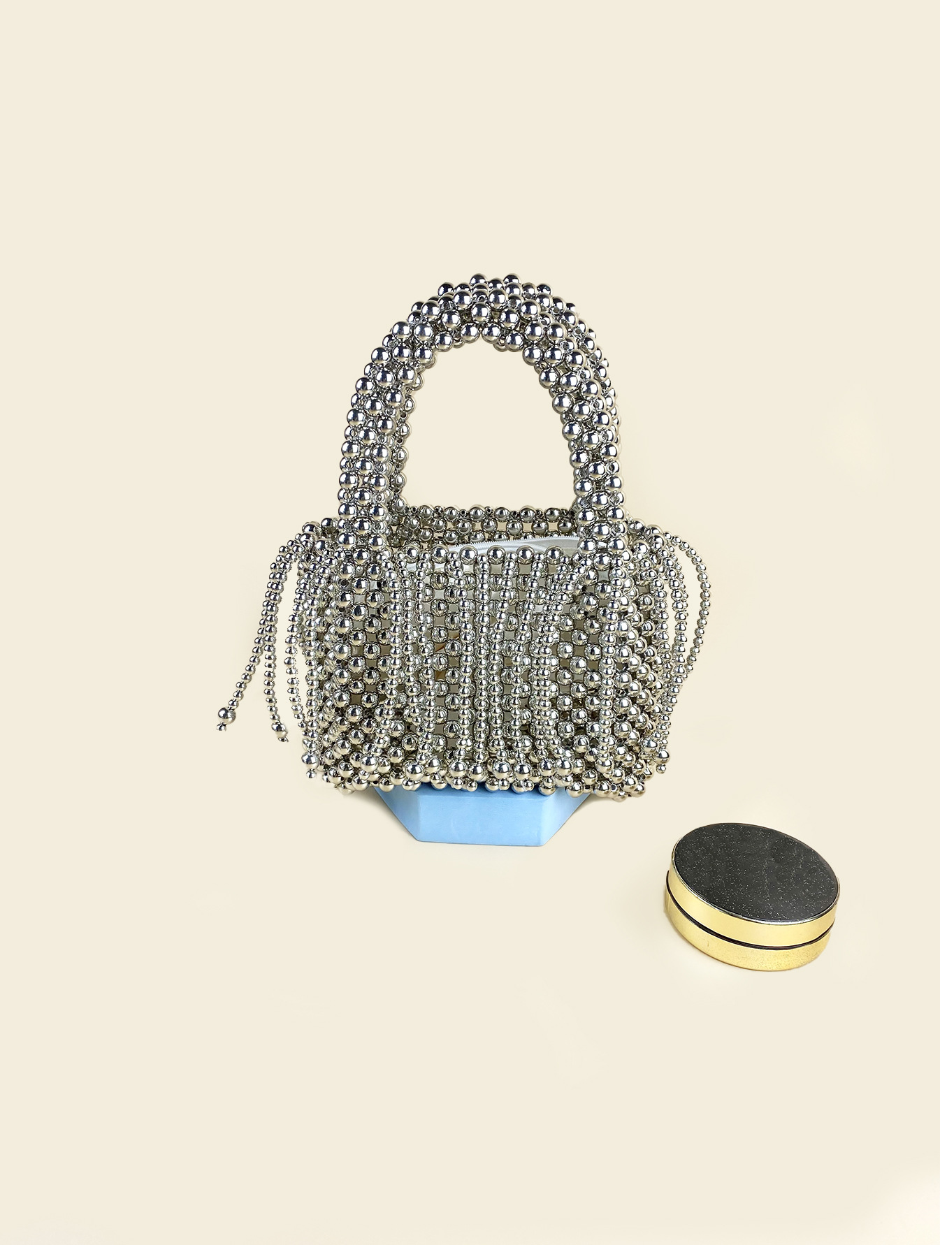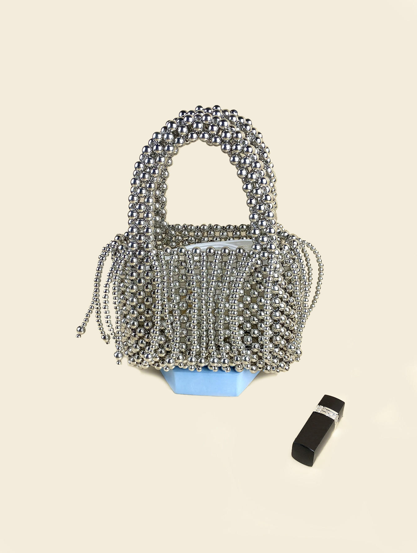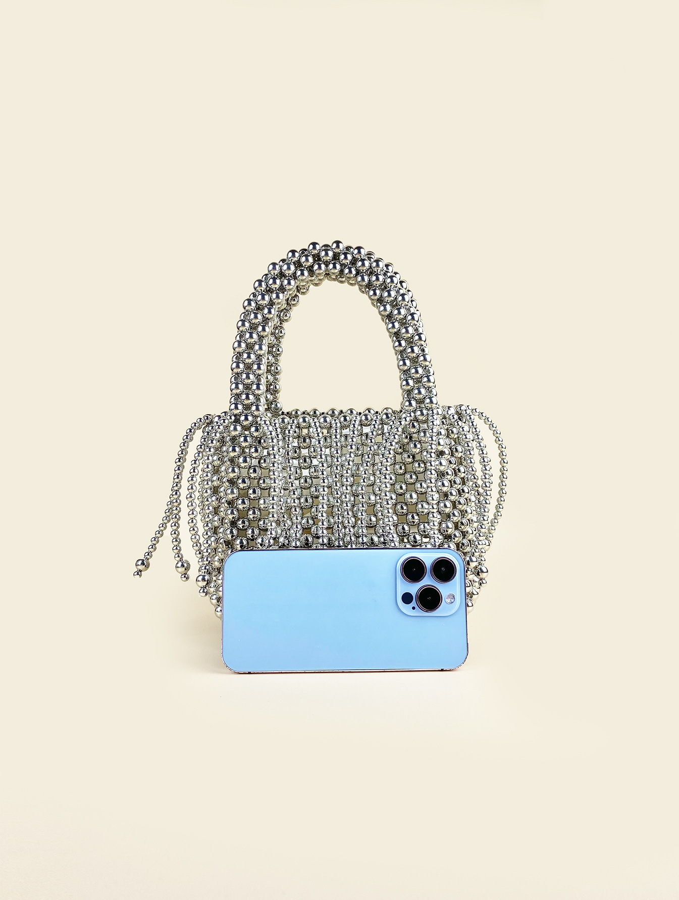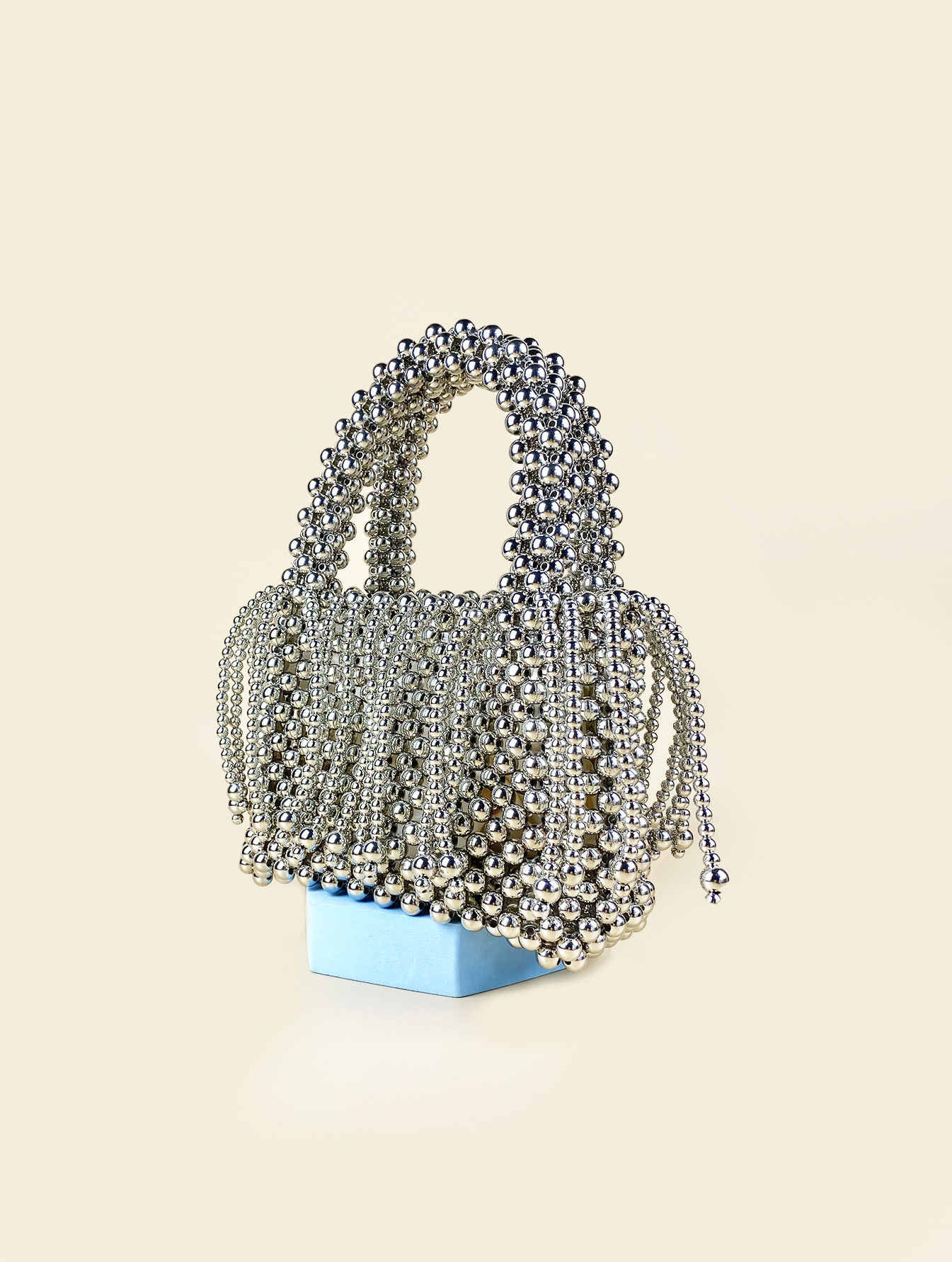 Tassel Hand Woven Metal Silver Beaded Square Vegetable Basket Pearl Bucket Hand Held Tote