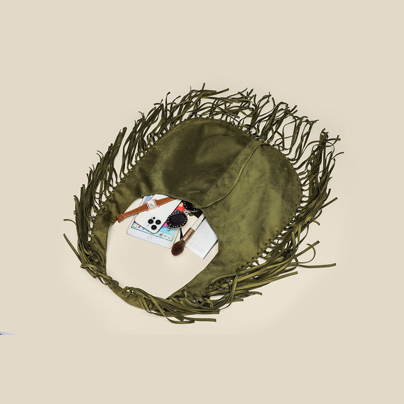 Tassel Large Capacity Tote Crescent Trendy One Shoulder Women Bag Casual Simple Crossbody Suede Retro Dumpling Bag