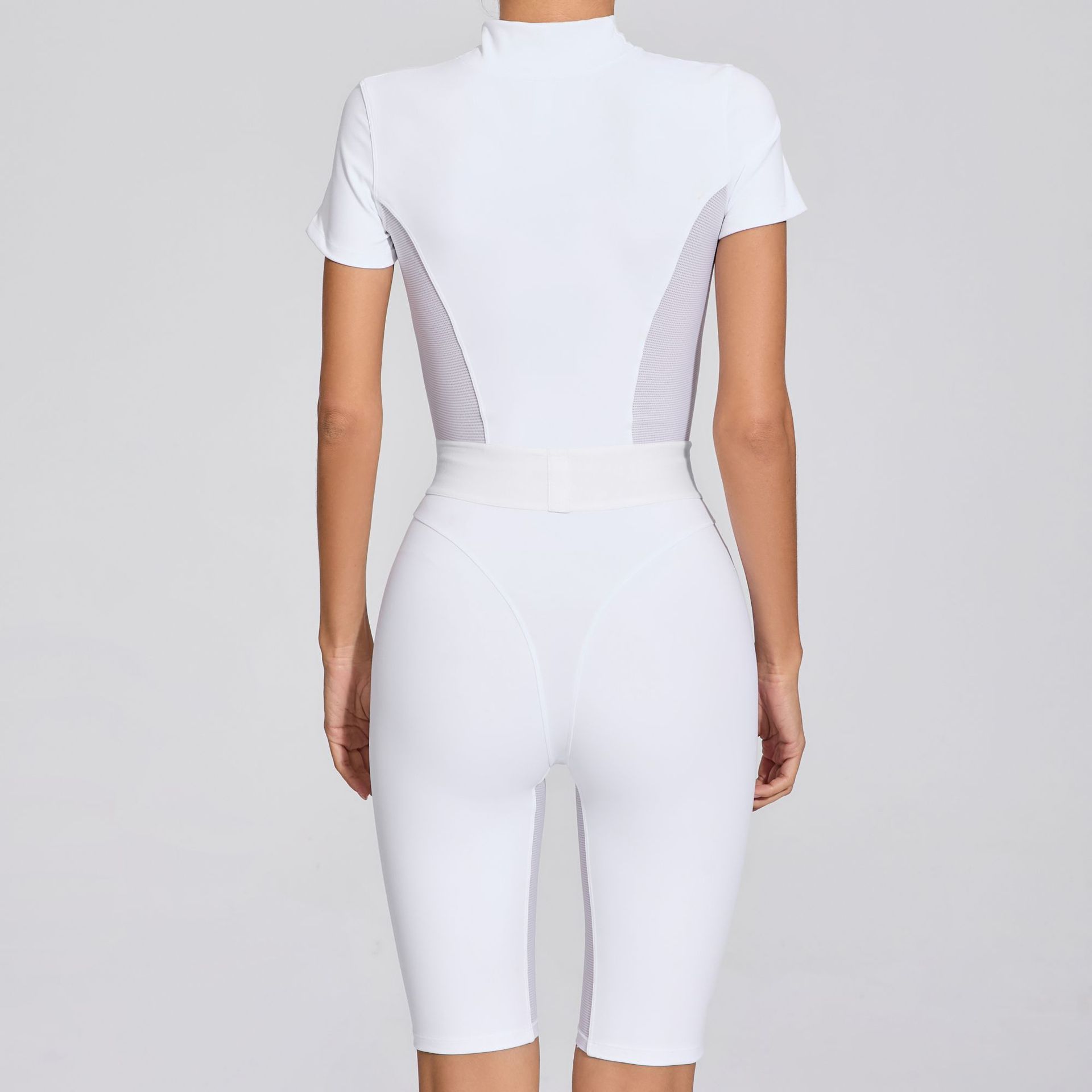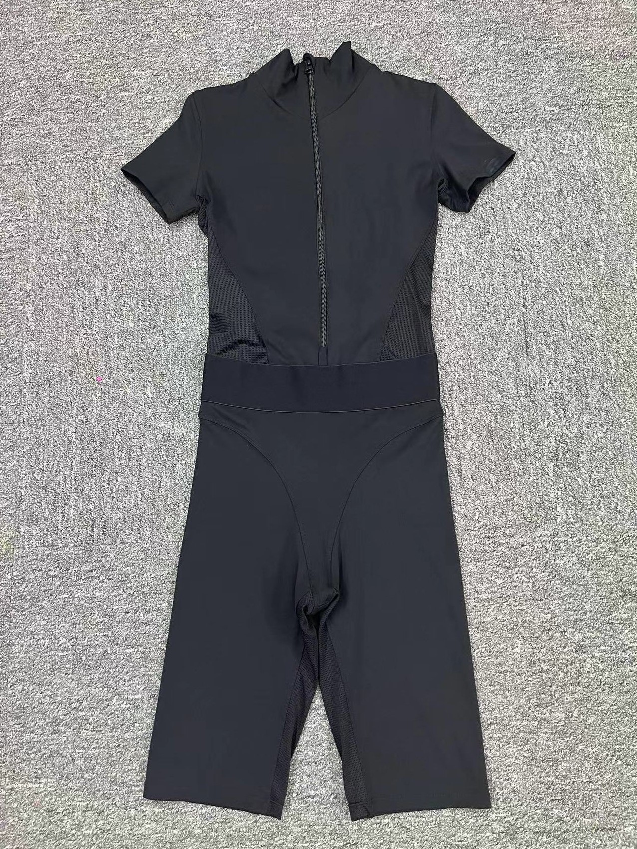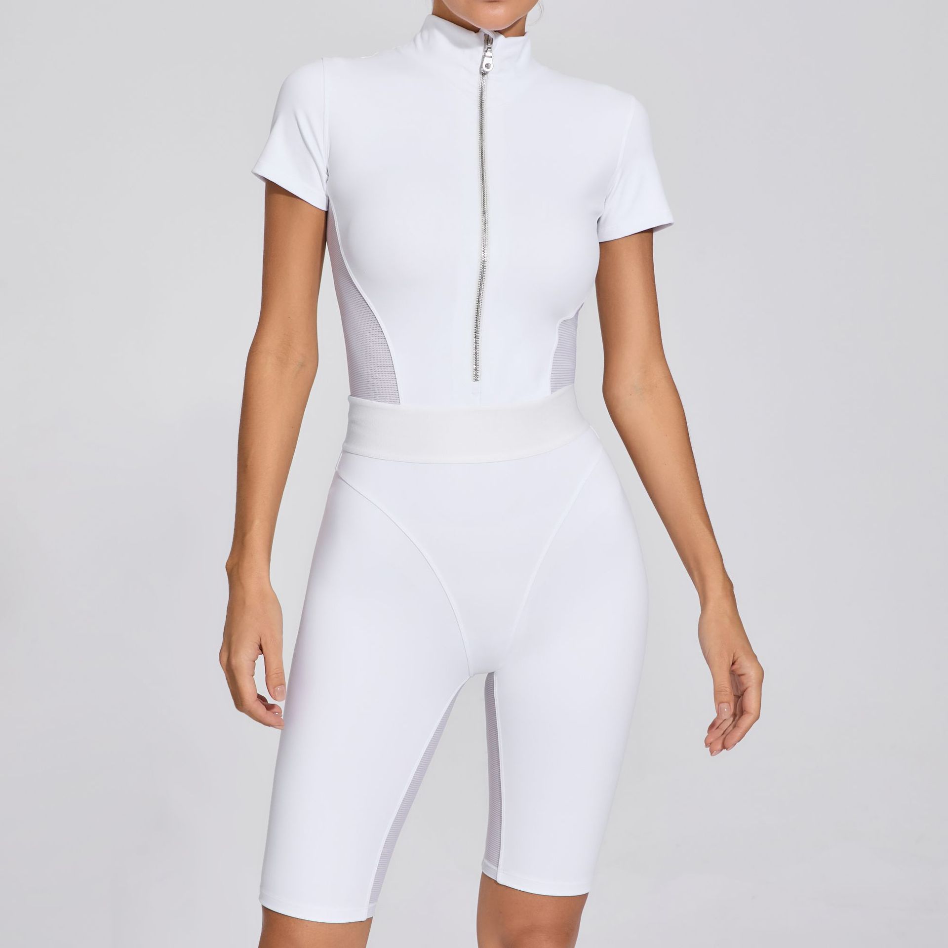 Tight Waist Open Collar Zipper Short Sleeve Yoga Jumpsuit Women Patchwork Fitness Tight Sports Jumpsuit