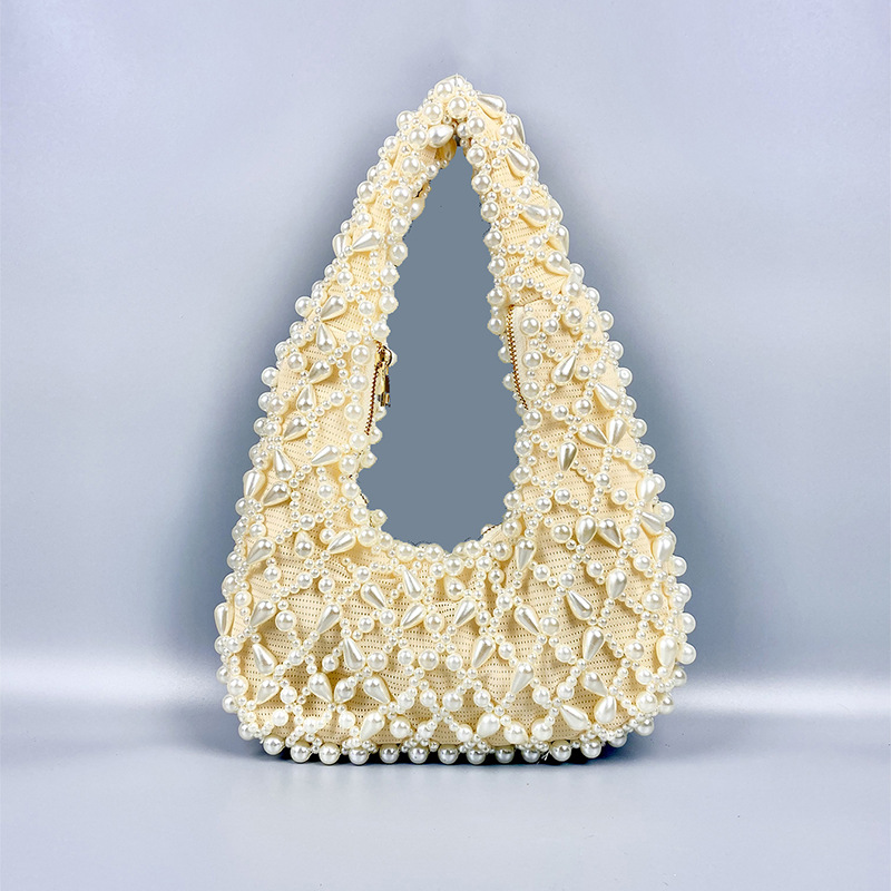 Trendy Women Pearl Rhinestone Advanced Texture Handmade Beaded Weave Portable Office Underarm Bag