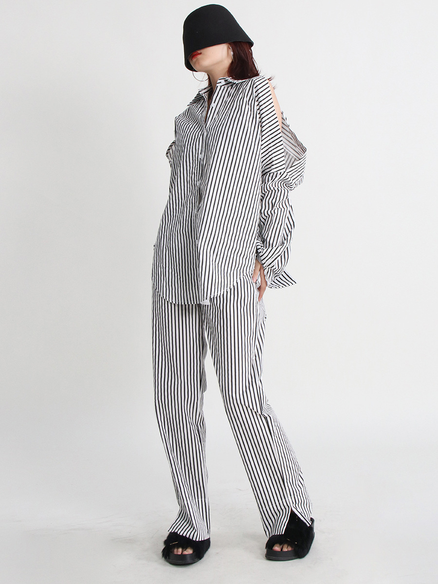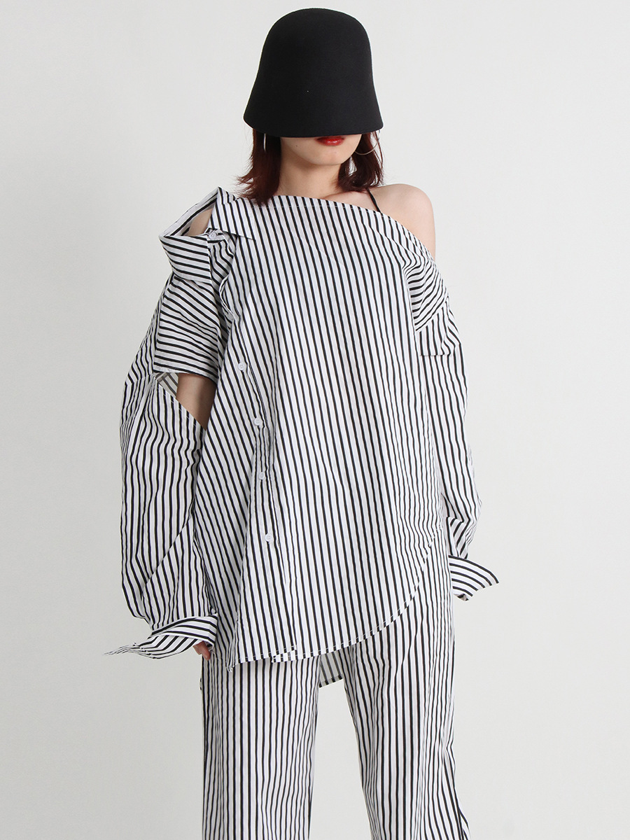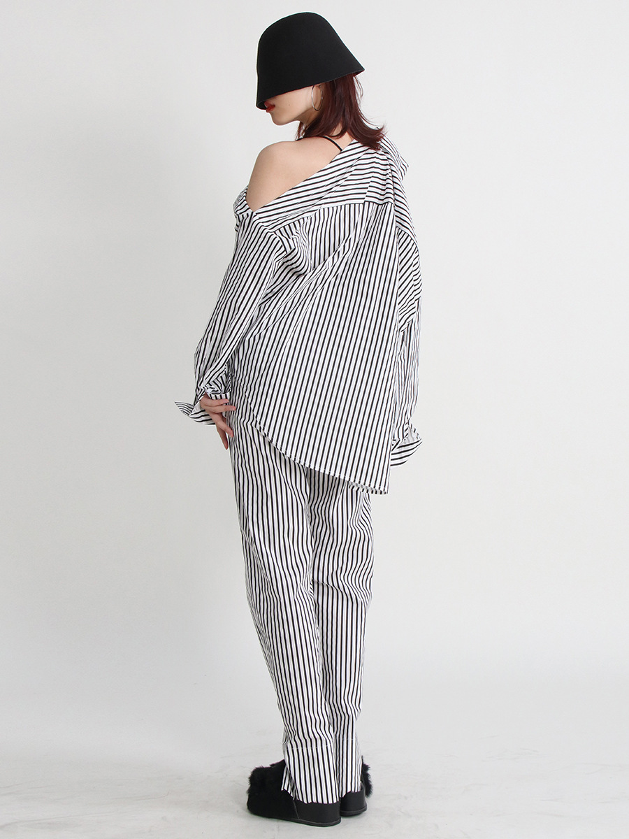 Urban Casual Simple Autumn Irregular Asymmetric Multi Way Shirt Mid Waist Straight Trousers Striped Set