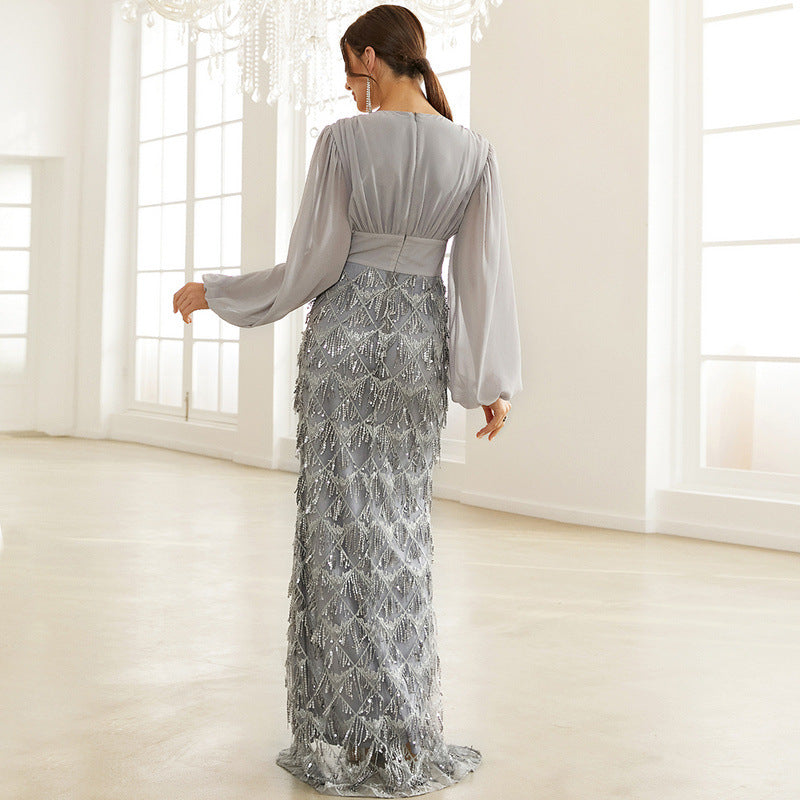 Wedding Spring Autumn V-neck Long Sleeve Chinese High-Waist Blue Sequined Tassel Evening Dress for Women