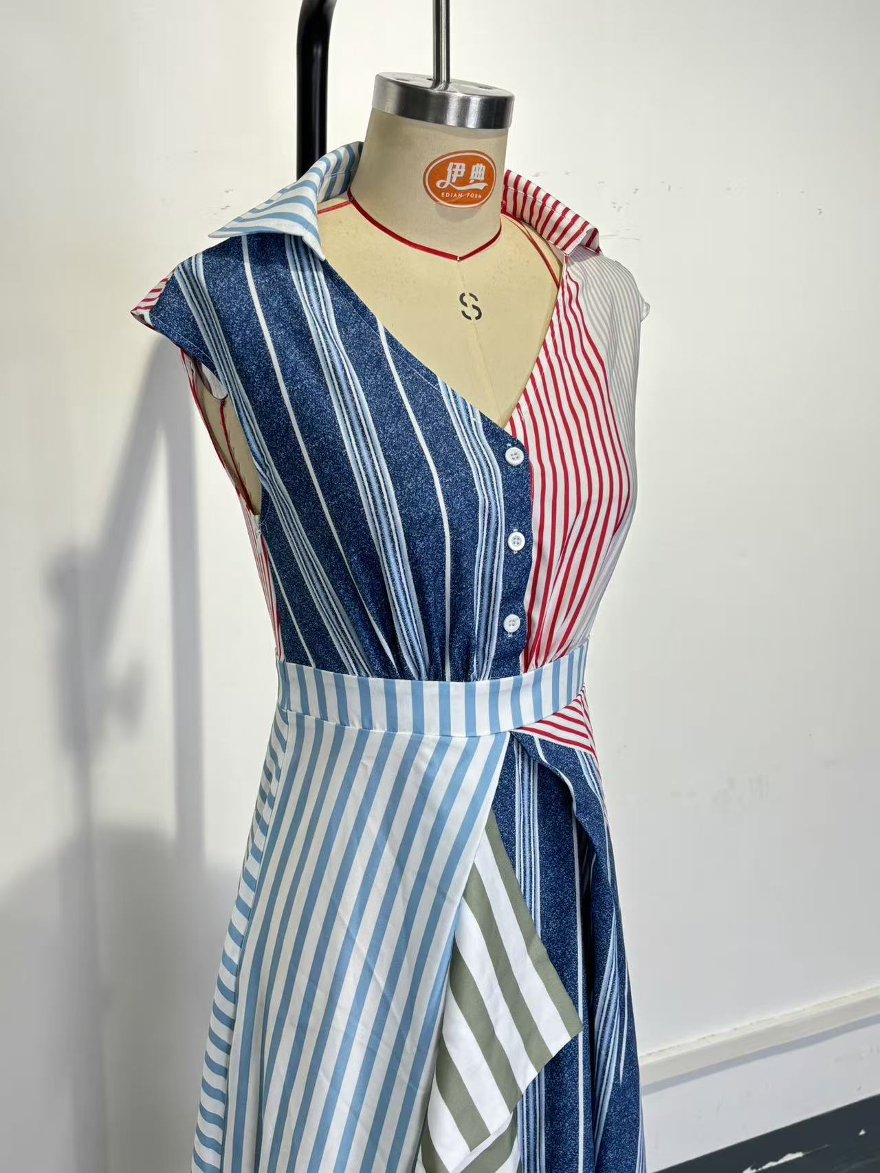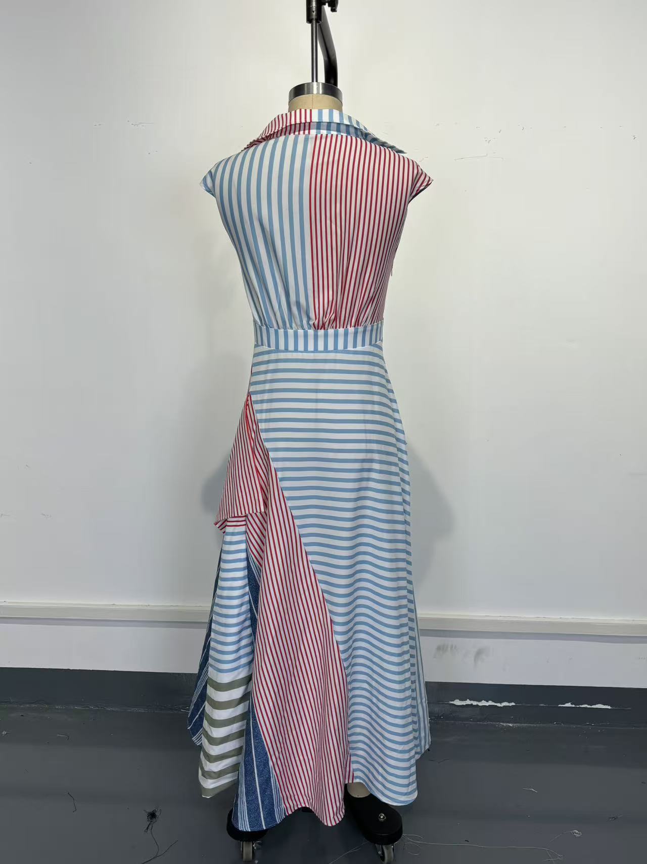 Women Clothes Cool Contrast Color Patchwork Stripes V neck Dress Irregular Asymmetric Cinched A line Dress