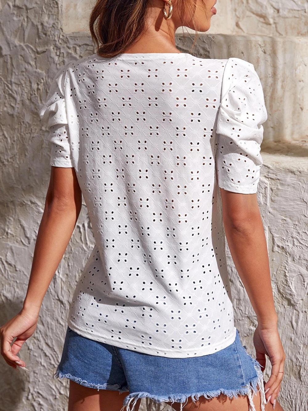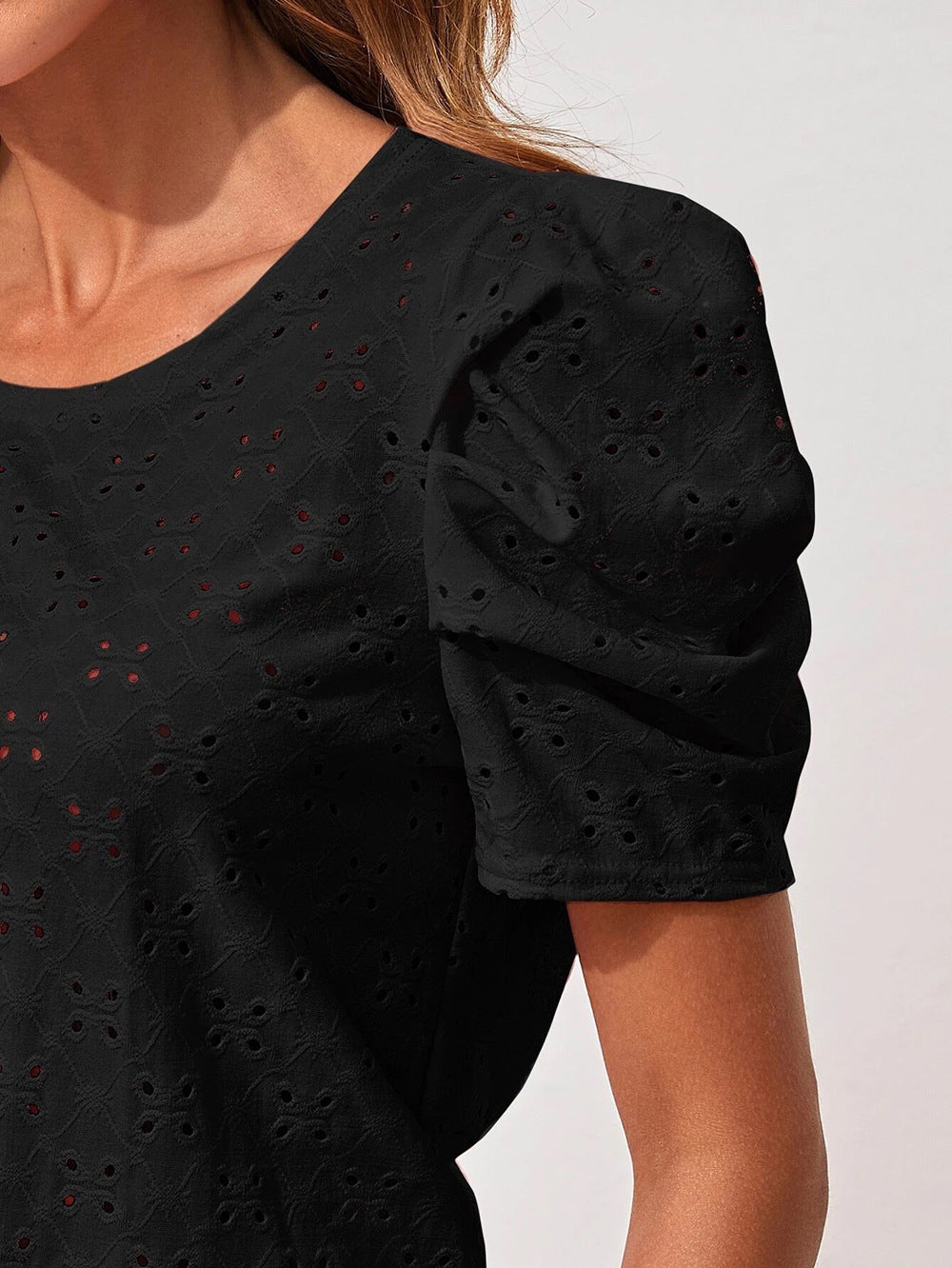 Women Clothes Spring Summer Solid Color T shirt Hollow Out Jacquard round Neck Puff Sleeve Top