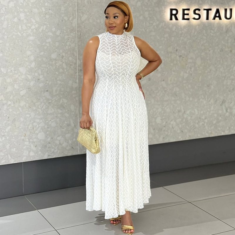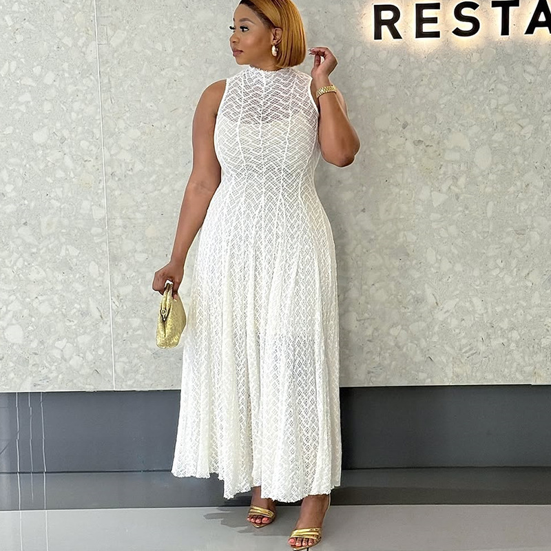 Women Clothing Autumn Dignified Sense Design round Neck Sleeveless Slim Lace White Dress