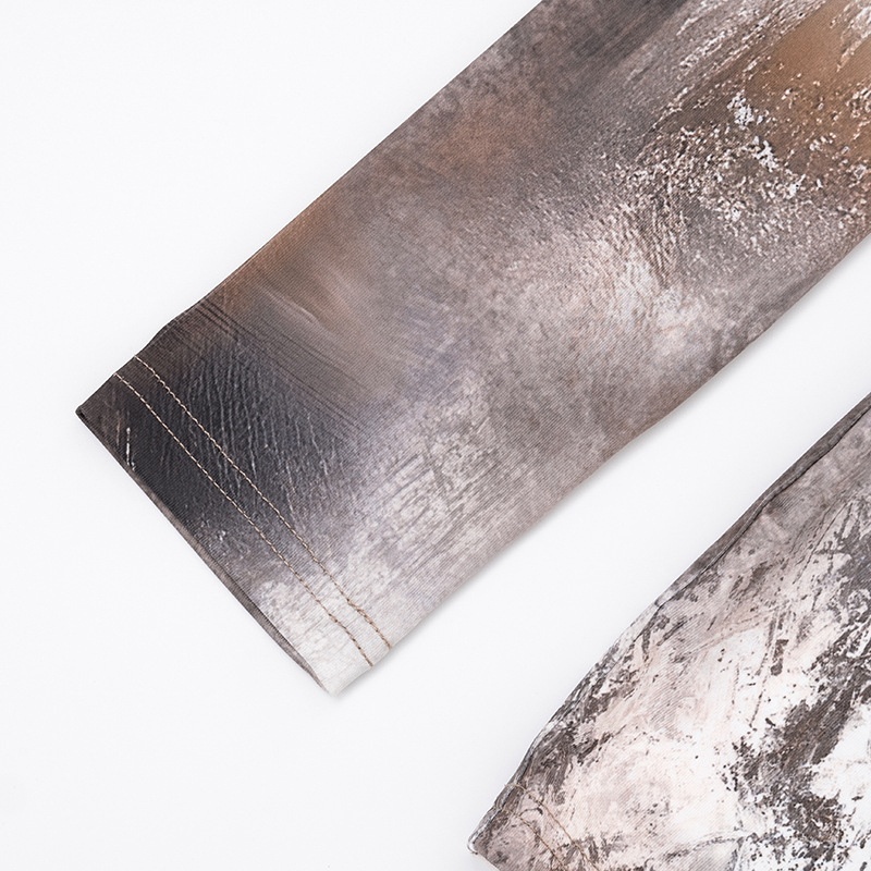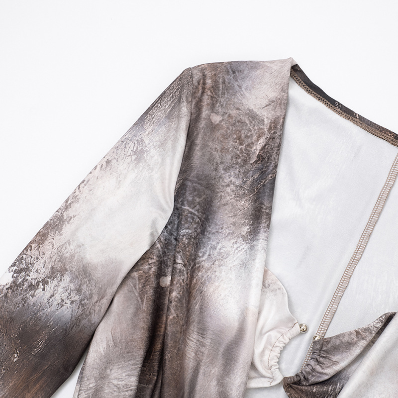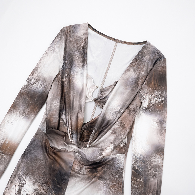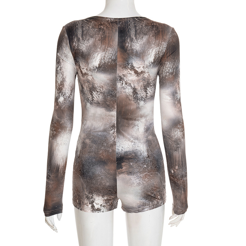 Women Clothing Autumn Slim Ink Blooming Printing Swing Collar Faux Two Pieces Long Sleeve Jumpsuit