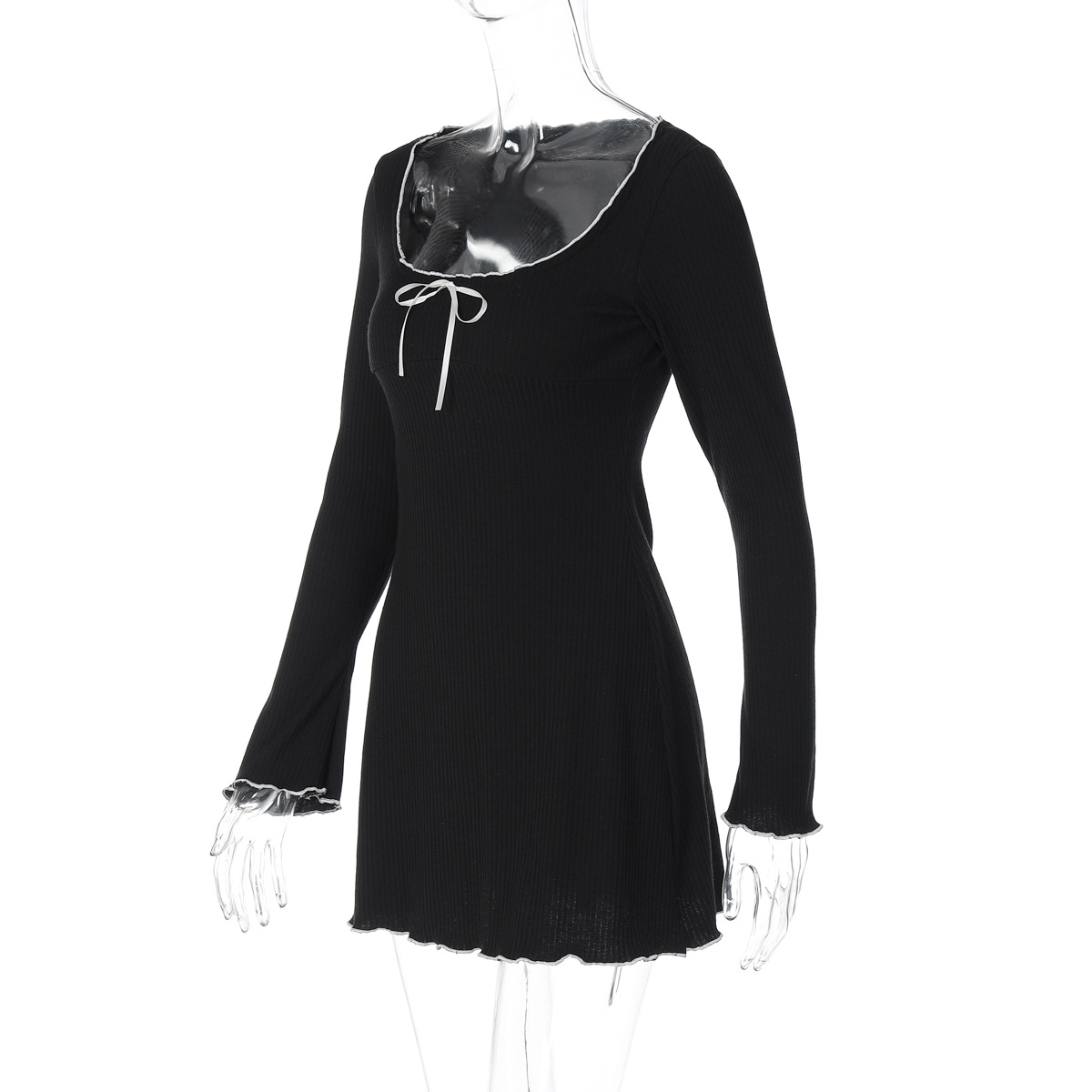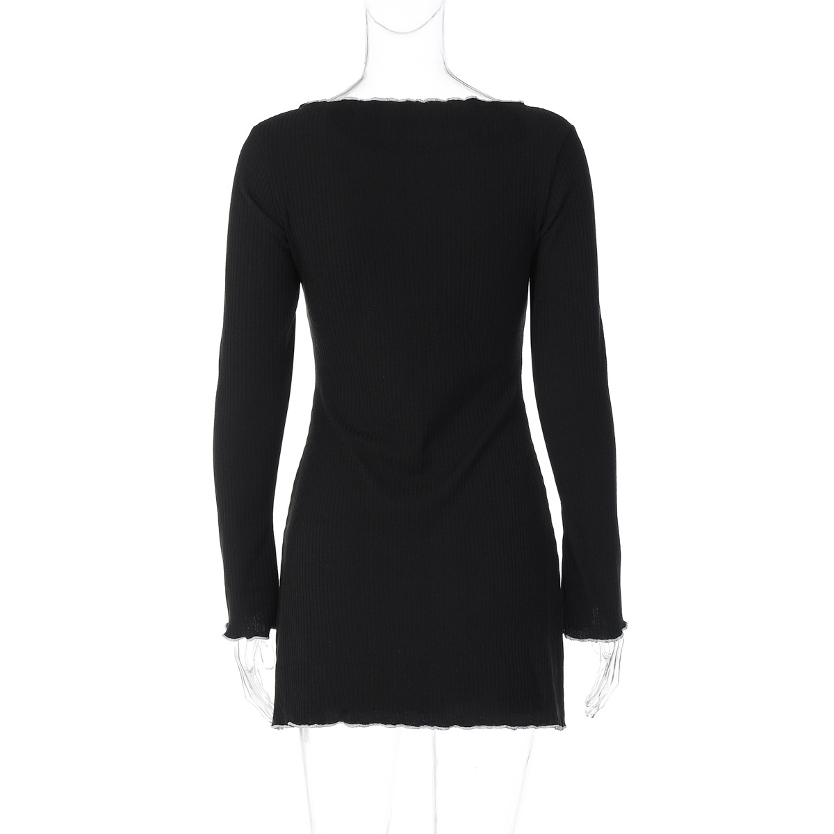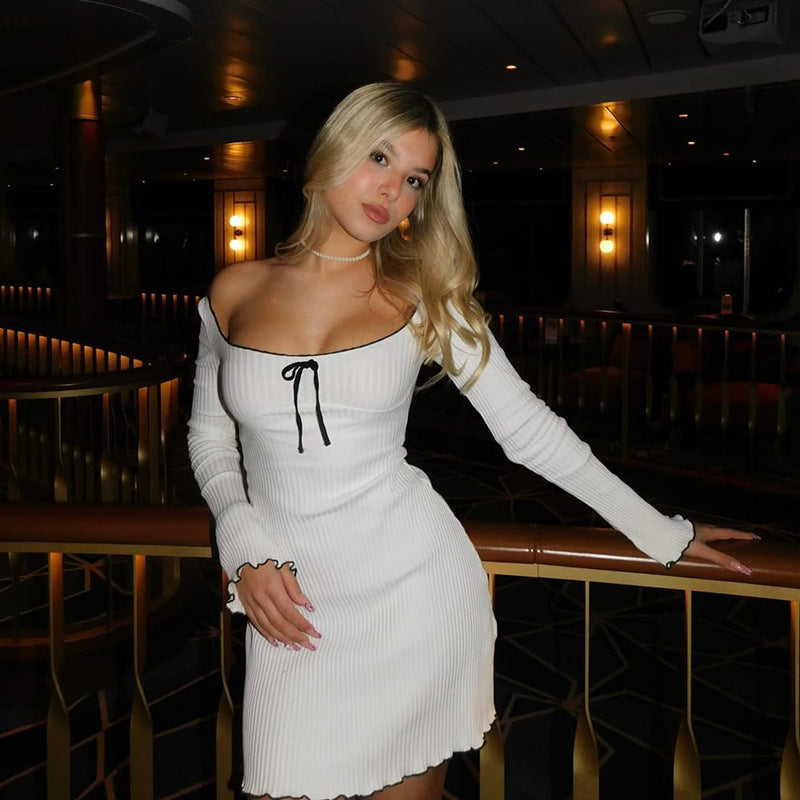 Women Clothing Autumn U-Shaped Collar Contrast Color Wooden Ear Waist Slimming Dress