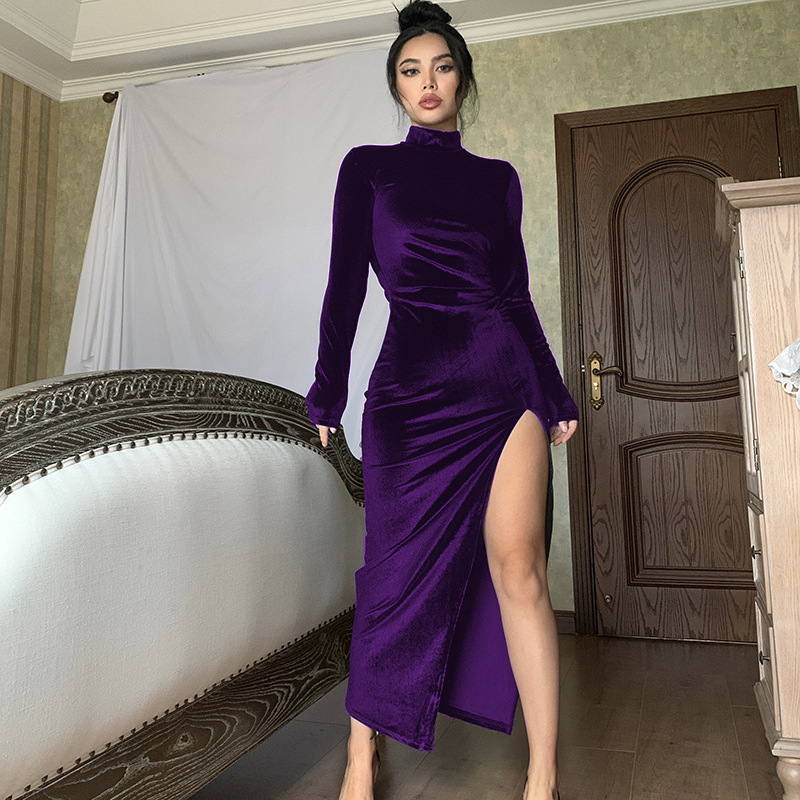 Women Clothing Autumn Winter Turtleneck Maxi Dress Slim Pleated Split Dress