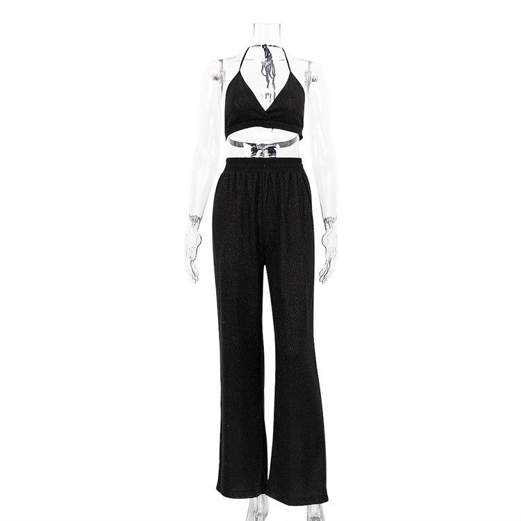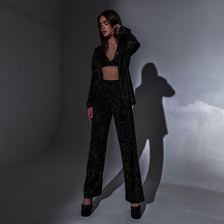 Women Clothing Glitter Three Piece Set Sexy Party Long Sleeve Suit Top High Waist Trousers Suit