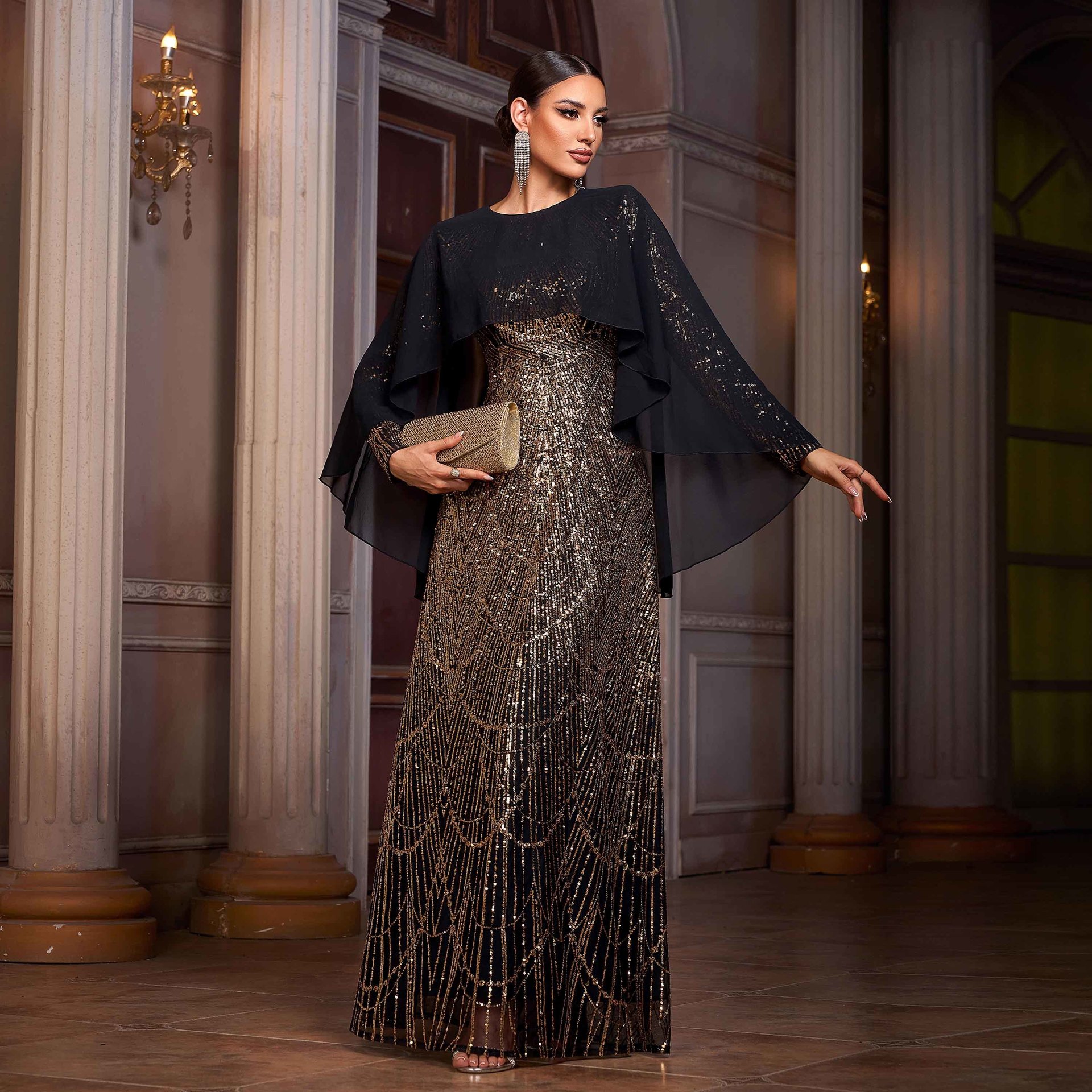 Women Clothing High Grade Long Sleeved round Neck Shawl Cocktail Sequined A Swing Evening Dress Women