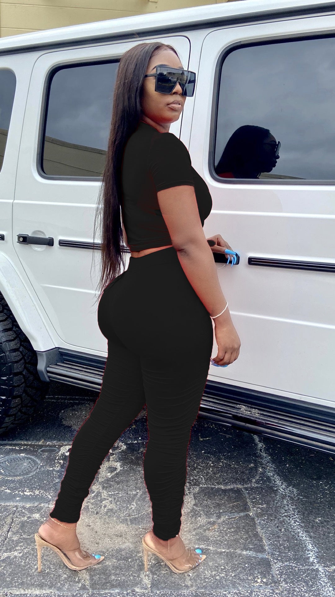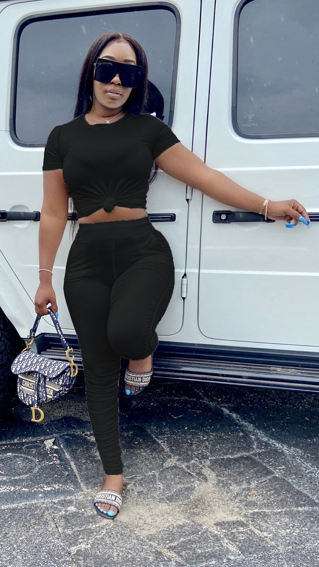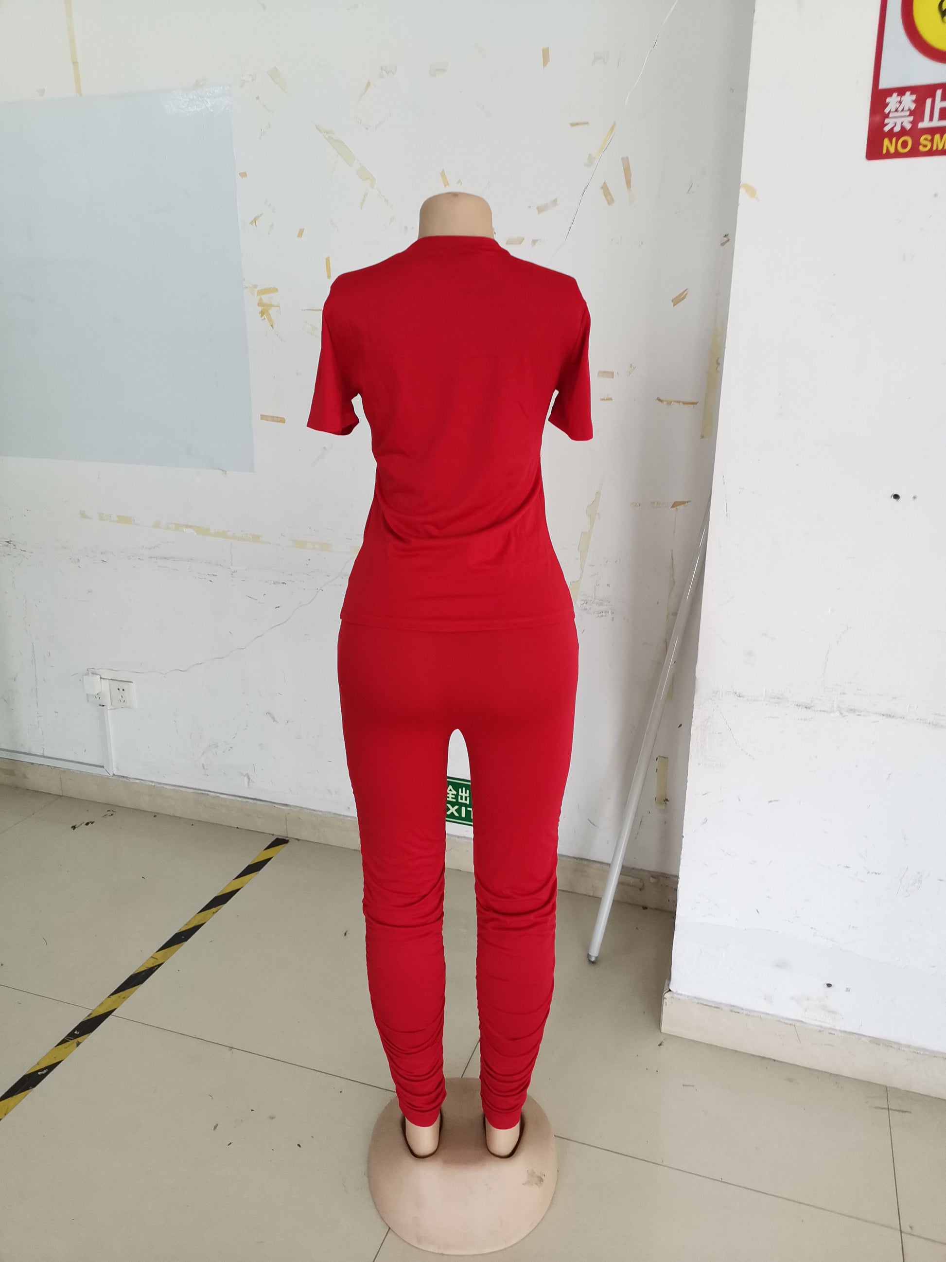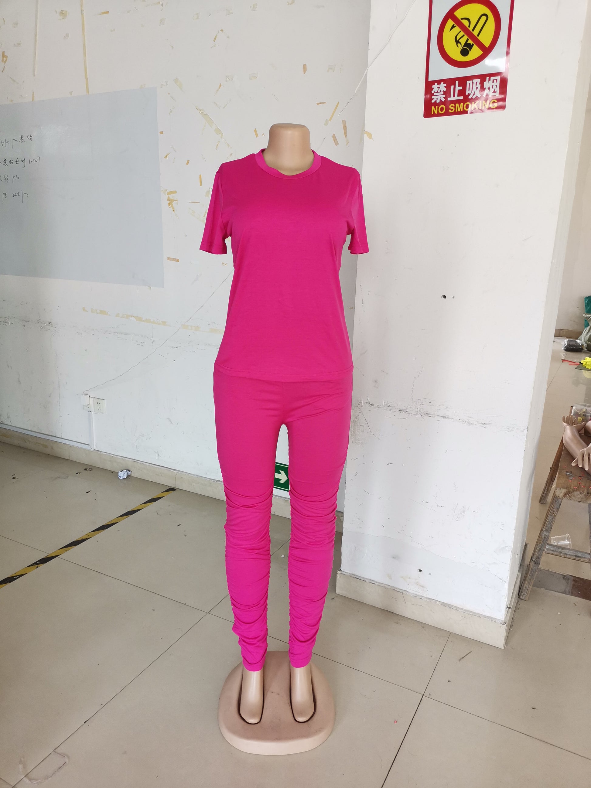 Women Clothing Ruched Short-Sleeved Suit T-shirt Two-Piece Set Solid Color Tight Summer