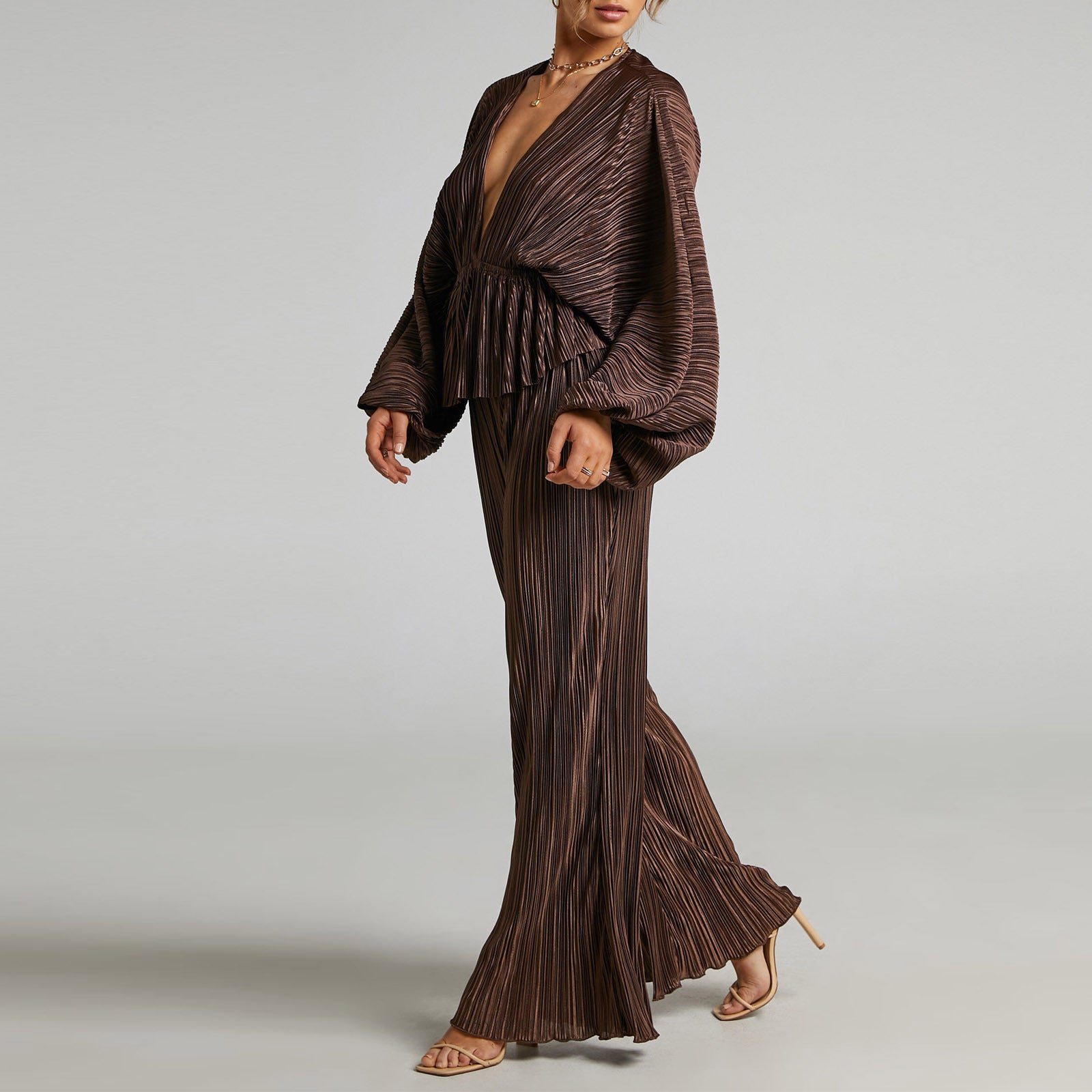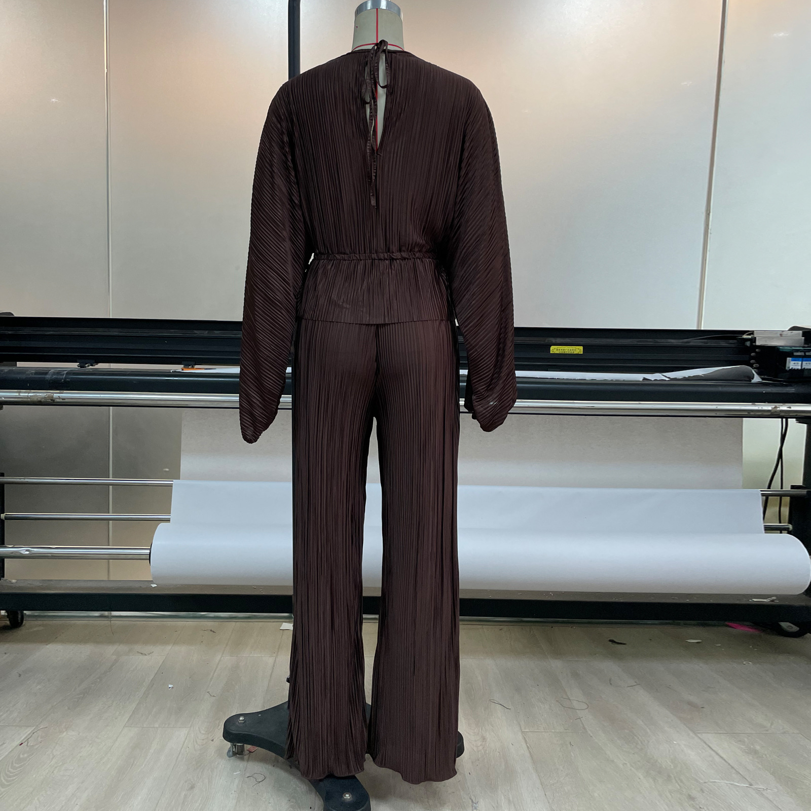 Women Clothing Set Autumn Winter High Elastic Pleated Waist Deep V Plunge Plunge Sexy Casual Wide Leg Pants Two Piece Set