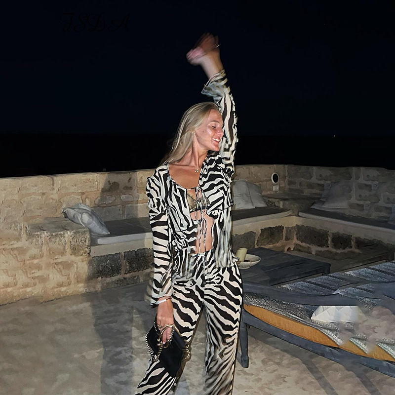 Women Clothing Sexy Drawstring Printed Long Sleeve Shirt Top Casual Bandage Two Piece Pants