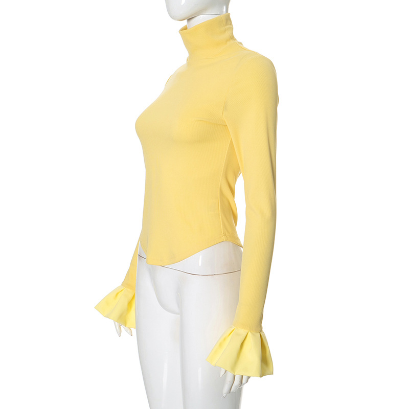 Women Clothing Solid Color Turtleneck Ruffled Long U Shaped Hem Elegant Short Top
