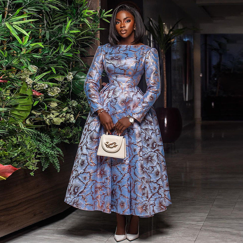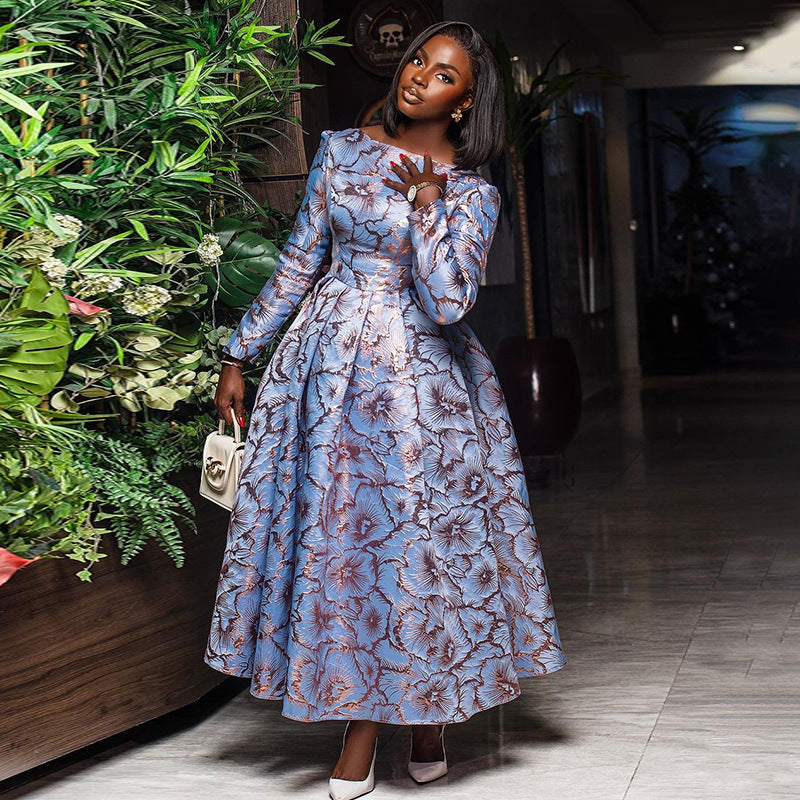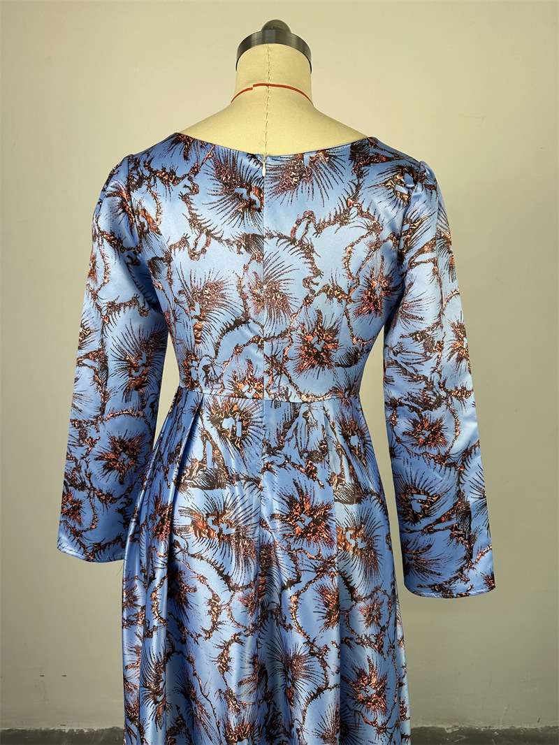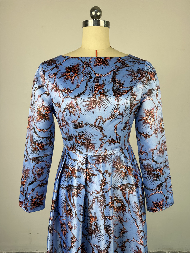 Women Clothing Spring Crew Neck Long Sleeve Tight Waist Mid Length A line Pleated Dress