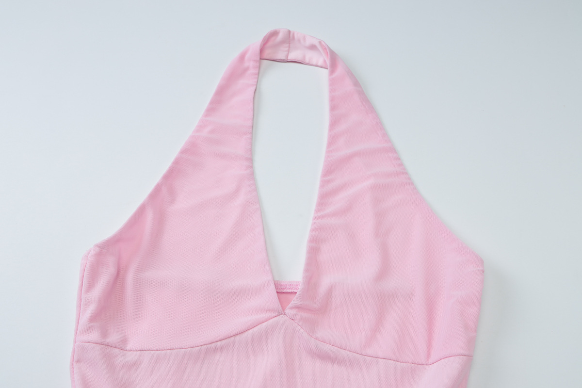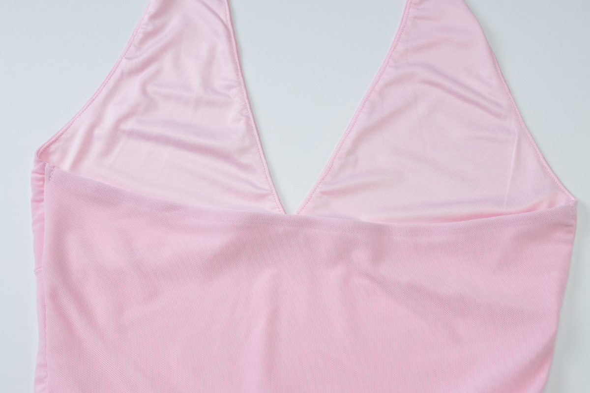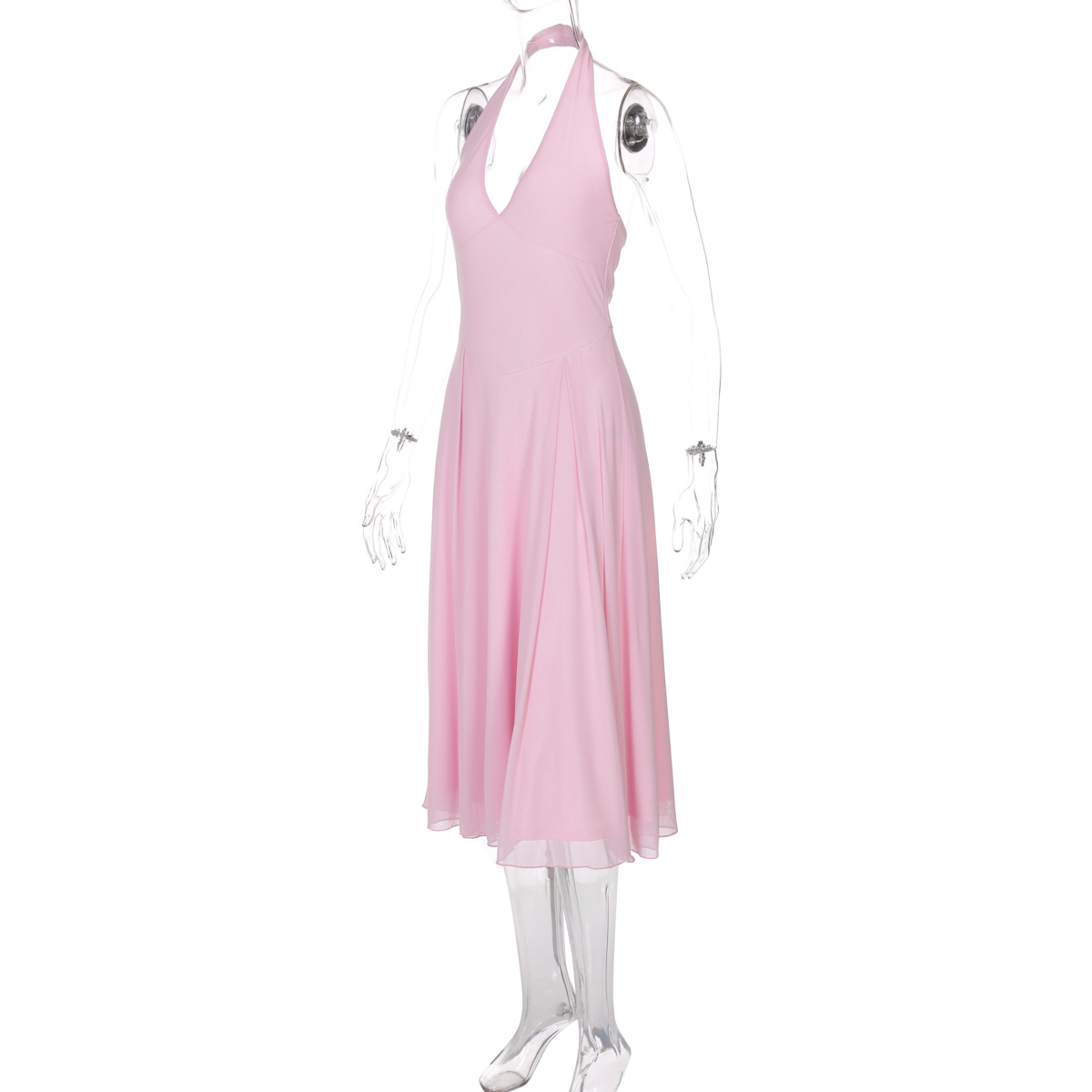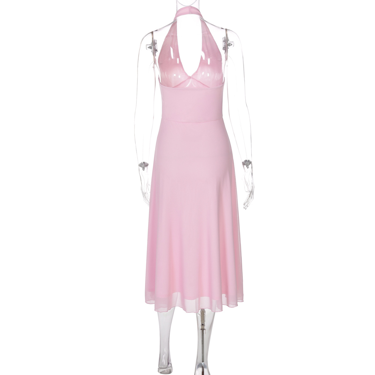 Women Clothing Summer Solid Color Halter Backless Gauzy Stitching Dress