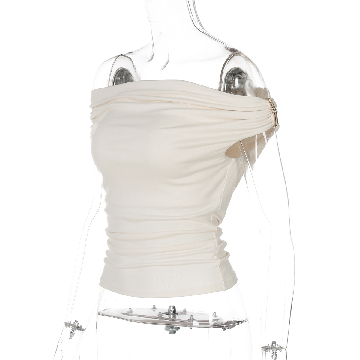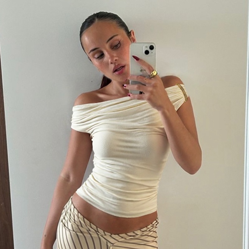 Women Clothing Summer Solid Color off Neck Pleated Slim Fit Sleeveless T shirt Top
