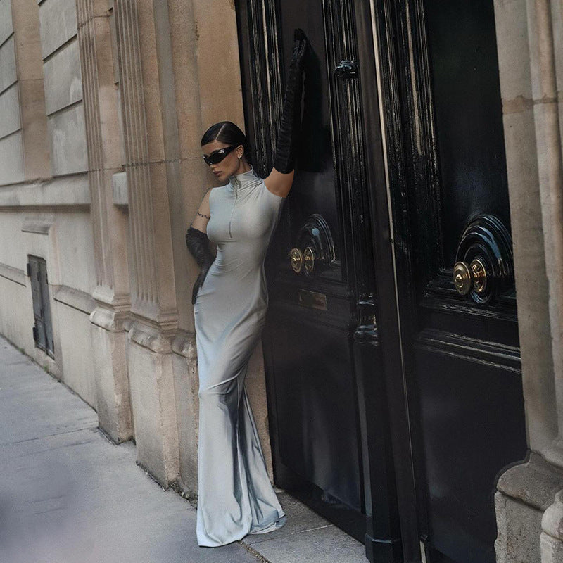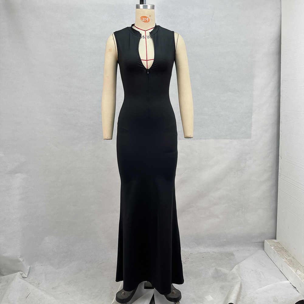 Women Clothing Summer Solid Color Simple Casual Zipper Sleeveless Slim Fit Dress Women Dress