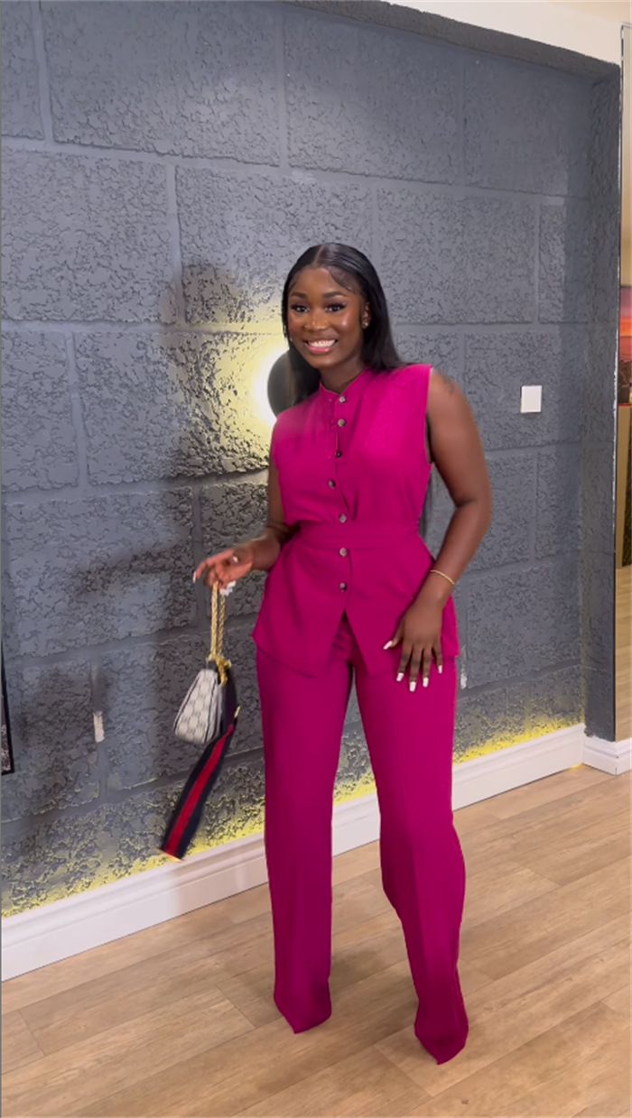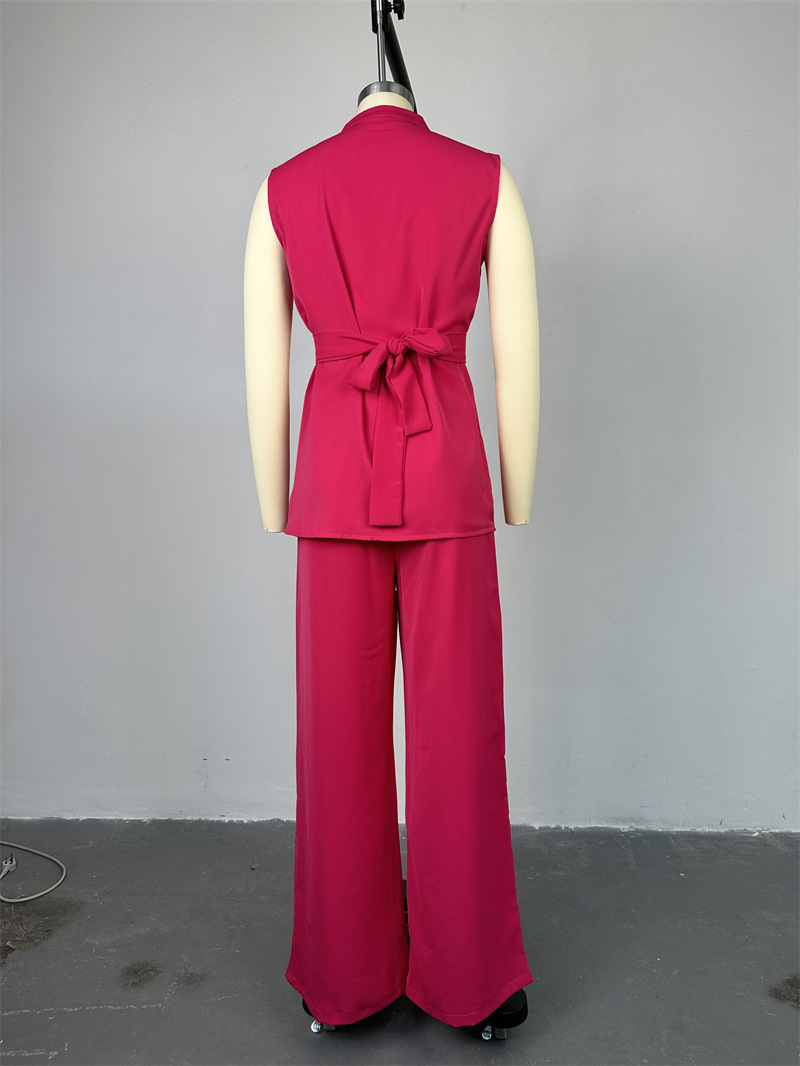 Women Clothing Summer Stand Collar Breasted Sleeveless Waist Controlled Lace Up Top Wide Leg Trousers Suit