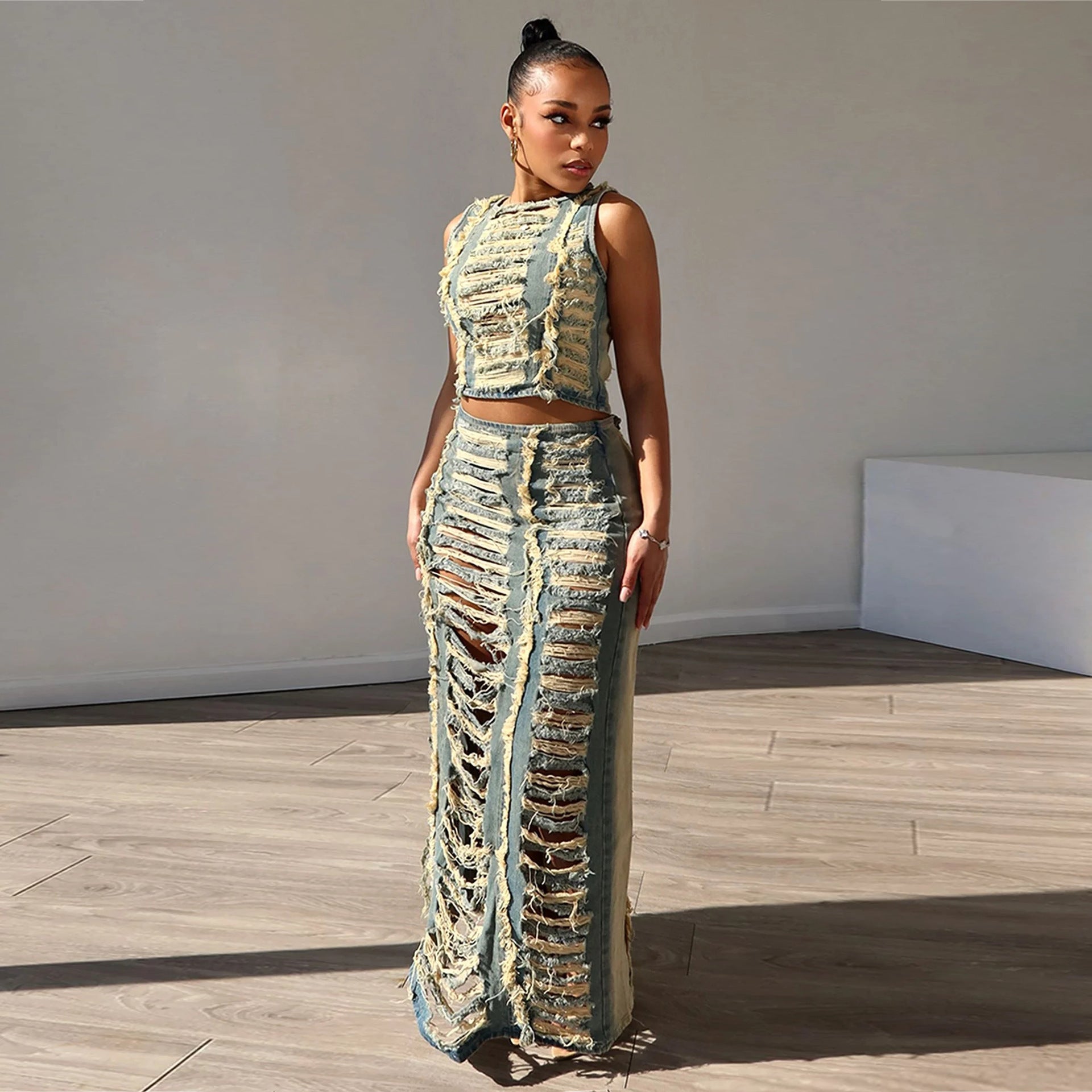 Women Denim Suit Women Personalized Hand Worn Vest High Slit Denim Skirt Set