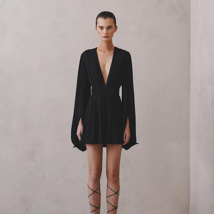Women Spring Clothing French Puff Sleeve High Waist Dress V Neck Sexy Abdomen Control Black Short Dress