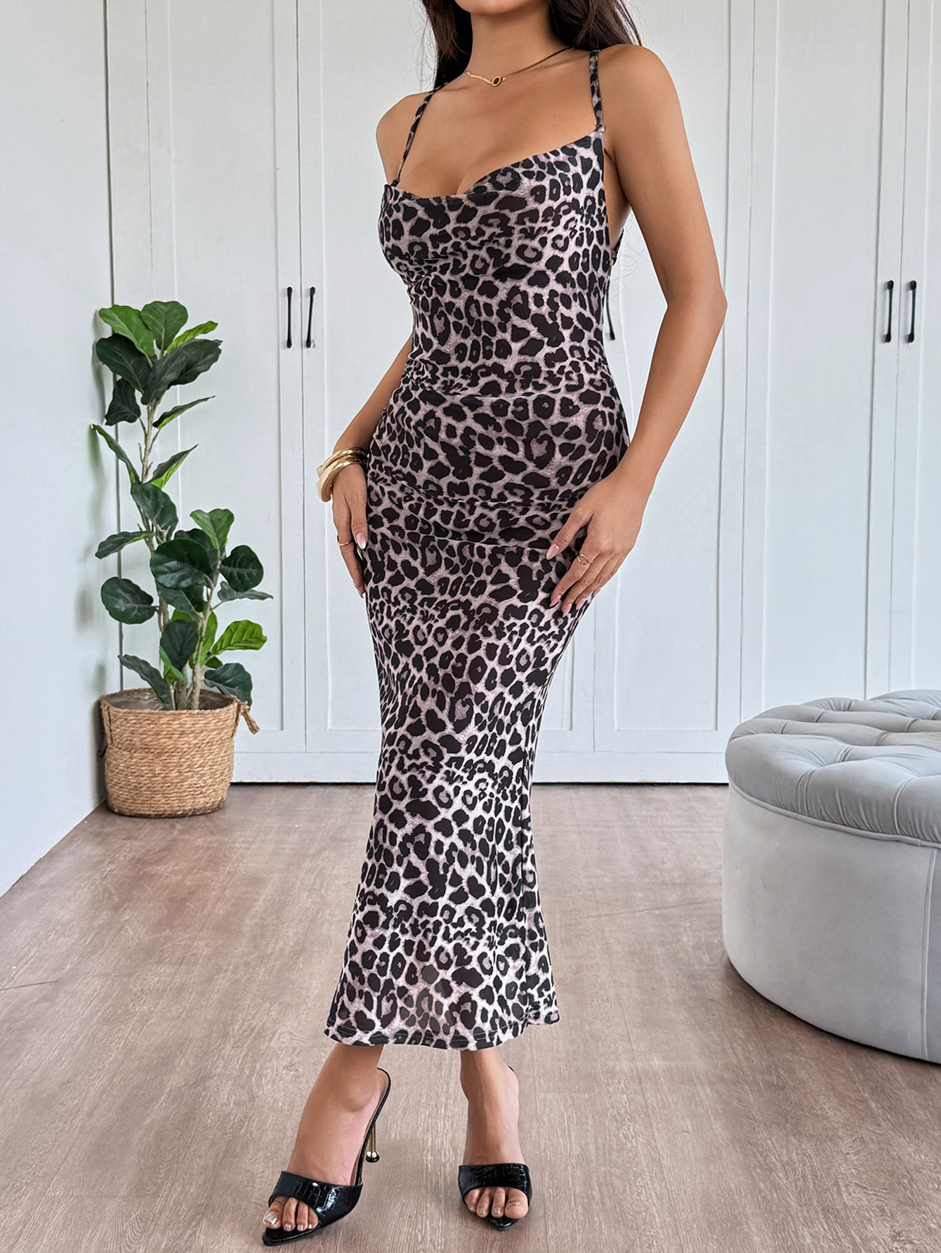 Women Summer Slim Fit Sheath Sexy Backless Spaghetti Straps Leopard Print Dress Mid Length Dress