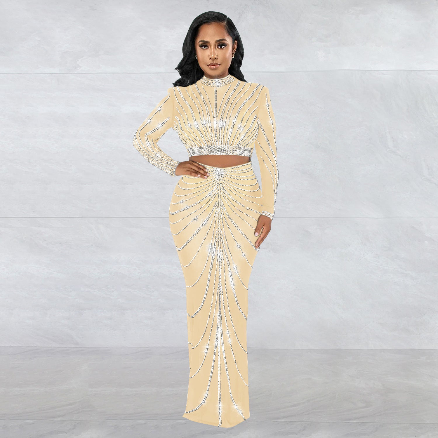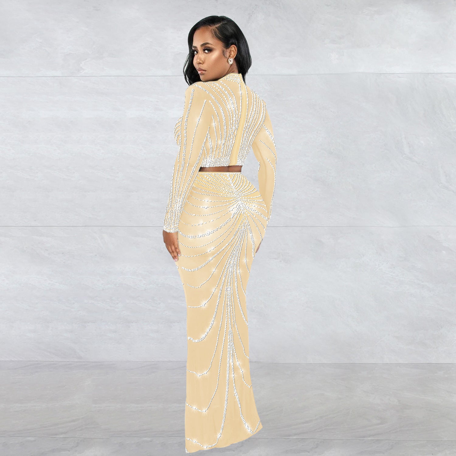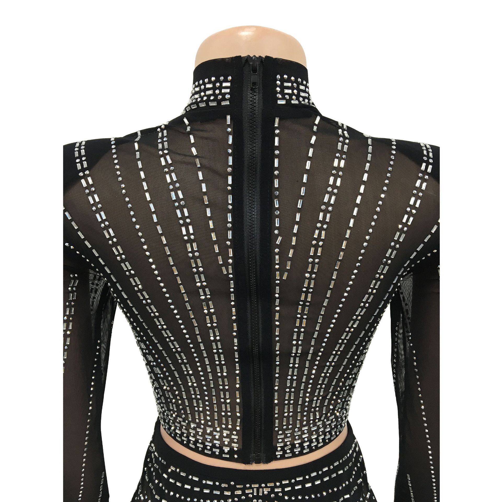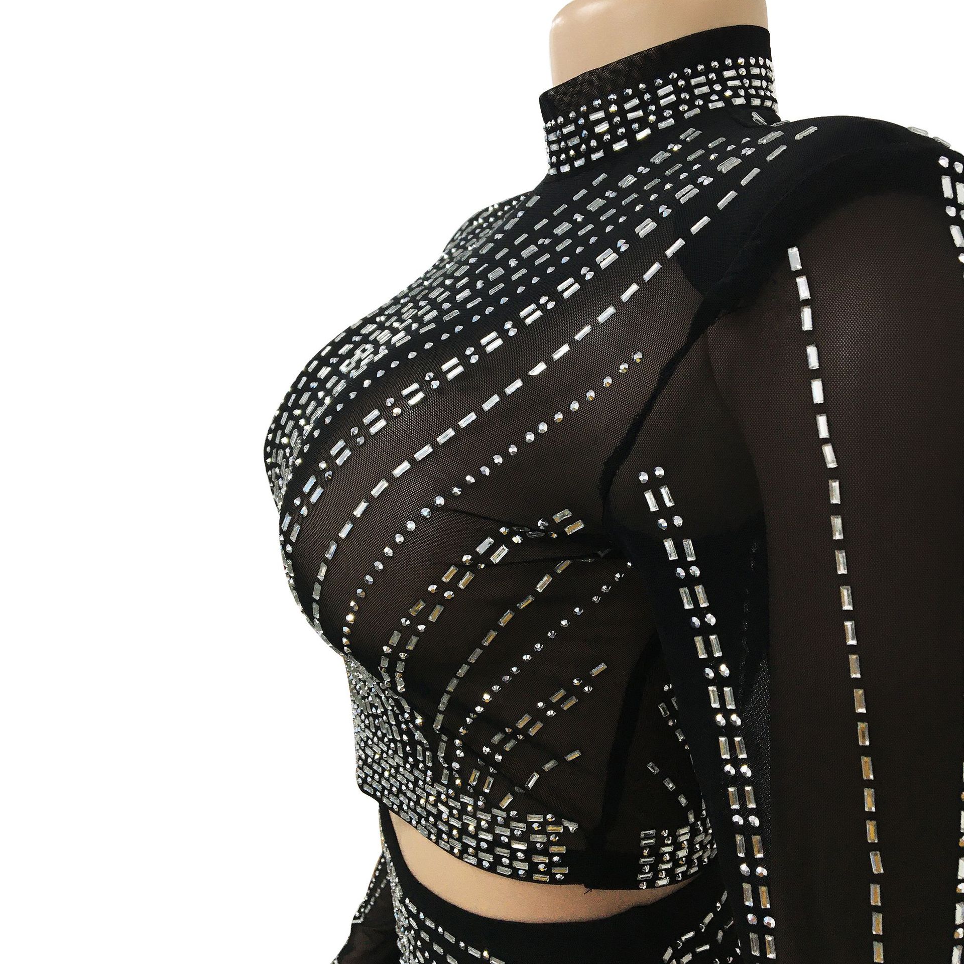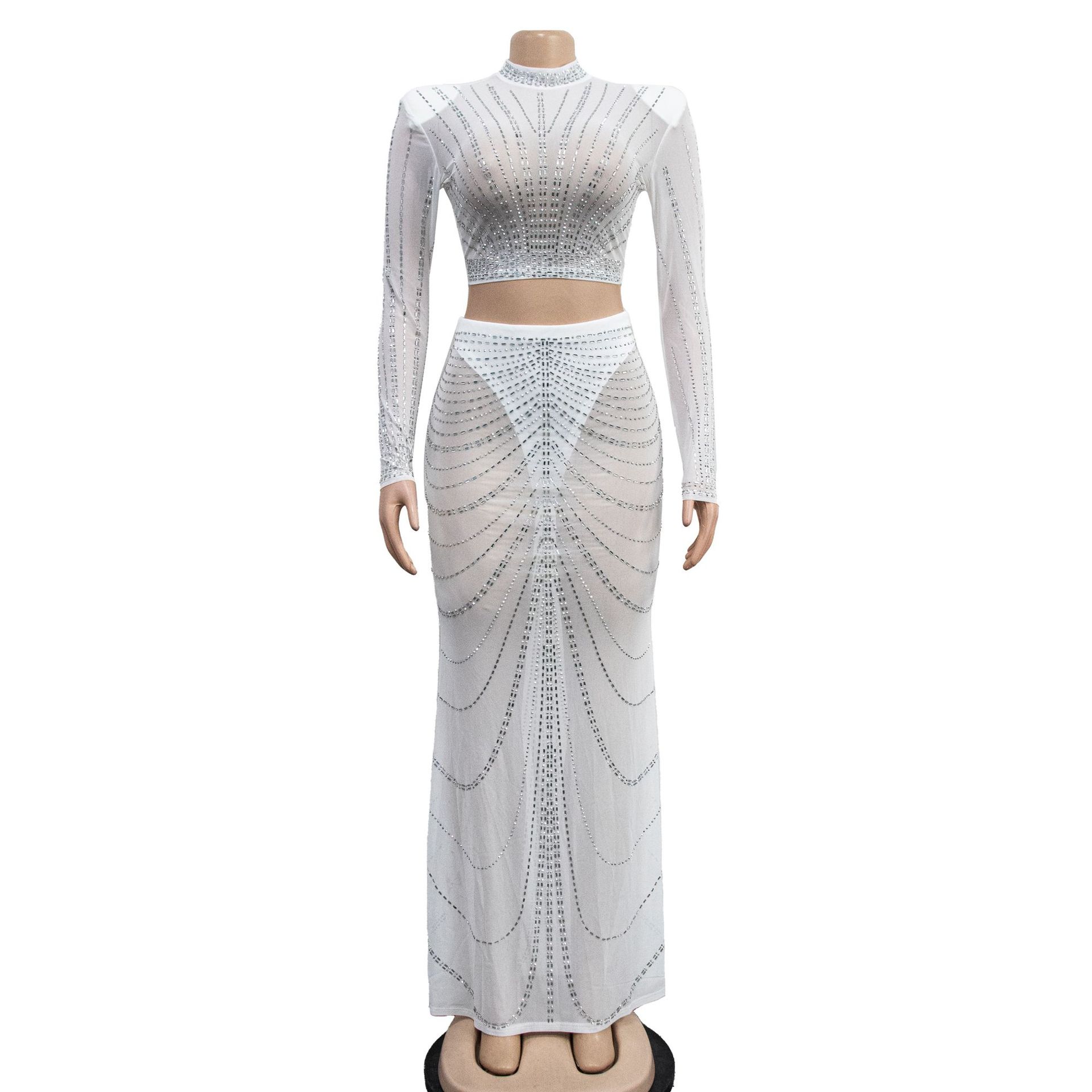 Women Wear Mesh Drilling See through Long Sleeve Dress Two Piece Set